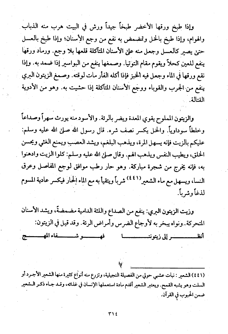 والزيتون المملوح يقوي المعدة ويضر بالرئة. والأسود منه يورث سهراً وصداعاً وخلطاً سوداوياً. والخل يكسر نصف شره. قال رسول الله صلى الله عليه وسلم: عليكم بالزيت فإنه يسهل المرة، ويذهب البلغم، ويشد العصب ويمنع الغثي ويحسن الخلق، ويطيب النفس ويذهب الهم. وقال صلى الله عليه وسلم: كلوا الزيت وادهنوا به، فإنه يخرج من شجرة مباركة. وهو حار رطب موافق لوجع المفاصل وعرق النسا، ويسهل مع ماء الشعير شرباً ويتقيأ به مع الماء الحار فيكسر عادية المسوم لذغاً وشرباً.