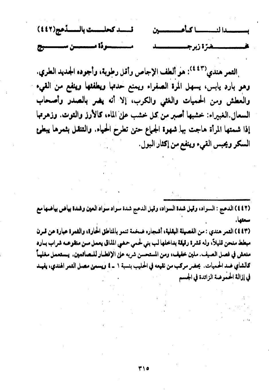 التمر هندي: هو ألطف الإجاص وأقل رطوبة، وأجوده الجديد الطري. وهو بارد يابس، يسهل المرة الصفراء ويمنع حدتها ويطفئها وينفع من القيء والعطش ومن الحميات والغثي والكرب، إلا أنه يضر بالصدر وأصحاب السعال.