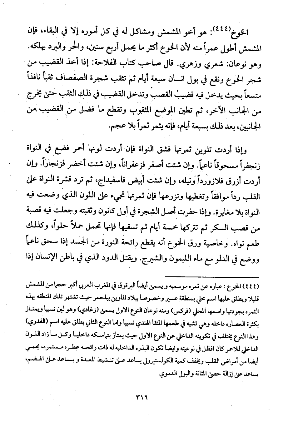 الخوخ: هو أخو المشمش ومشاكل له في كل أموره إلا في البقاء، فإن المشمش أطول عمراً منه لأن الخوخ أكثر ما يحمل أربع سنين، والحر والبرد يهلكه. وهو نوعان: شعري وزهري. قال صاحب كتاب الفلاحة: إذا أخذ القضيب من شجر الخوخ ونقع في بول انسان سبعة أيام ثم تثقب شجرة الصفصاف ثقباً نافذاً متسعاً بحيث يدخل فيه قضيب القصب وتدخل القضيب في ذلك الثقب حتى يخرج من الجانب الآخر، ثم تطين الموضع المثقوب وتقطع ما فضل من القضيب من الجانبين، بعد ذلك بسبعة أيام، فإنه يثمر ثمراً بلا عجم.