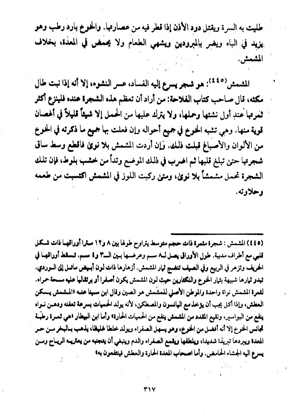 المشمش: هو شجر يسرع إليه الفساد، عسر النشوء، إلا أنه إذا نبت طال مكثه، قال صاحب كتاب الفلاحة: من أراد أن تعظم هذه الشجرة عنده فلينزع أكثر ثمرتها عند أول نشئها وحملها، ولا يترك عليها من الحمل إلا شيئاً قليلاً في أغصان قوية منها. وهي تشبه الخوخ في جميع أحواله وإن فعلت بها جميع ما ذكرته في الخوخ من الألوان والأصباغ قبلت ذلك. وإن أردت المشمش بلا نوى فاقطع وسط ساق شجرتها حتى تبلغ قلبها ثم اضرب في ذلك الموضع وتداً من خشب بلوط، فإن تلك الشجرة تحمل مشمشاً بلا نوى، ومتى ركبت اللوز في المشمش اكتسبت من طعمه وحلاوته.