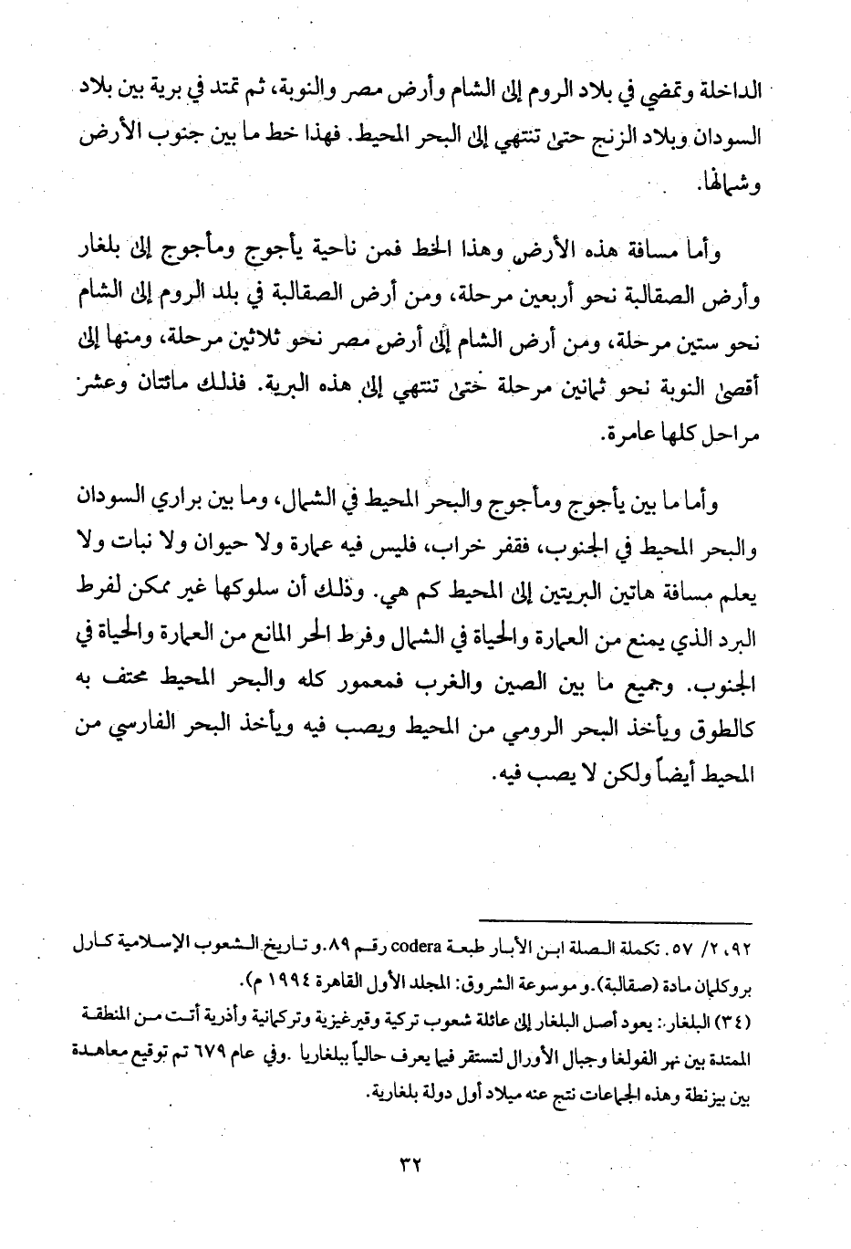 وأما ما بين يأجوج ومأجوج والبحر المحيط في الشمال، وما بين براري السودان والبحر المحيط في الجنوب، فقفر خراب، فليس فيه عمارة ولا حيوان ولا نبات ولا يعلم مسافة هاتين البريتين إلى المحيط كم هي. وذلك أن سلوكها غير ممكن لفرط البرد الذي يمنع من العمارة والحياة في الشمال وفرط الحر المانع من العمارة والحياة في الجنوب. وجميع ما بين الصين والغرب فمعمور كله والبحر المحيط محتف به كالطوق ويأخذ البحر الرومي من المحيط ويصب فيه ويأخذ البحر الفارسي من المحيط أيضاً ولكن لا يصب فيه.