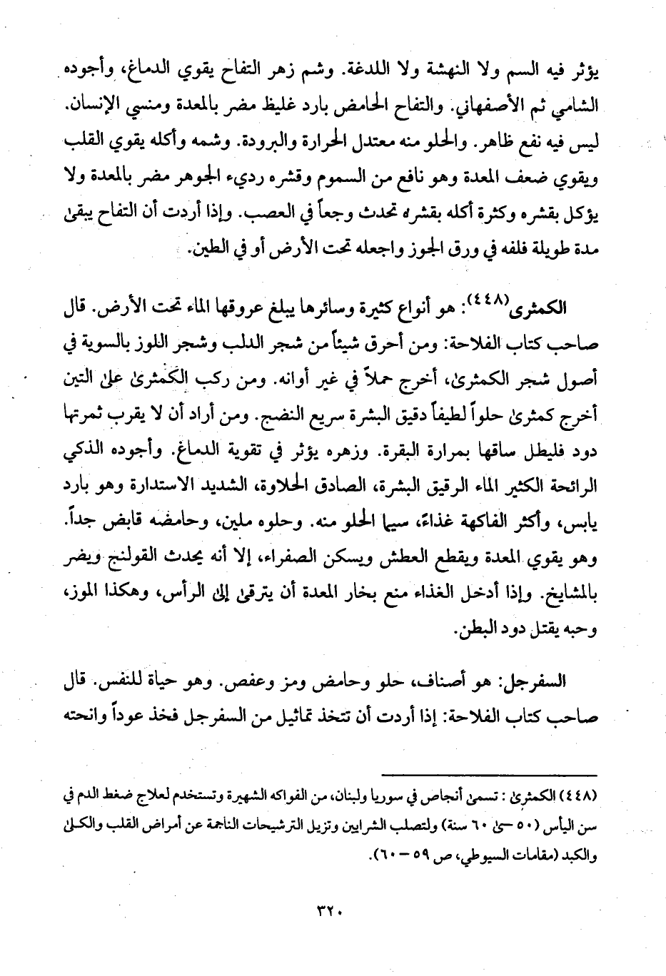 السفرجل: هو أصناف، حلو وحامض ومز وعفص. وهو حياة للنفس. قال صاحب كتاب الفلاحة: إذا أردت أن تتخذ تماثيل من السفرجل فخذ عوداً وانحته