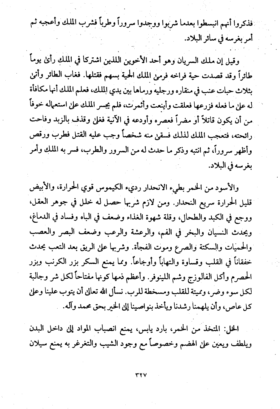 والأسود من الخمر بطيء الانحدار رديء الكيموس قوي الحرارة، والأبيض قليل الحرارة سريع النحدار. ومن لازم شربها حصل له خلل في جوهر العقل، ووجع في الكبد والطحال، وقلة شهوة الغذاء وضعف في الباه وفساد في الدماغ، ويحدث النسيان والبخر في الفم، والرعشة والرعب وضعف البصر والعصب والحميات والسكتة والصرع وموت الفجأة. وشربها على الريق بعد التعب يحدث خفقاناً في القلب وقساوة والتهاباً وأوجاعاً. ومما يمنع السكر بزر الكرنب وبزر الحصرم وأكل الفالوزج وشم اللينوفر. وأعظم ذمها كونها مفتاحاً لكل شر وجالبة لكل سوء وضر، ومميتة للقلب ومسخطة للرب. نسأل الله تعالى أن يتوب علينا وعلى كل عاص، وأن يلهمنا رشدنا ويأخذ بنواصينا إلى الخير بحق محمد وآله.