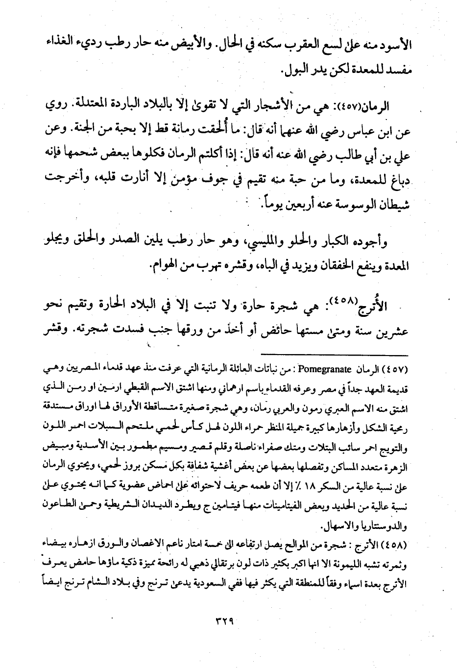 الرمان: هي من الأشجار التي لا تقوى إلا بالبلاد الباردة المعتدلة. روي عن ابن عباس رضي الله عنهما أنه قال: ما أُلحقت رمانة قط إلا بحبة من الجنة. وعن علي بن أبي طالب رضي الله عنه أنه قال: إذا أكلتم الرمان فكلوها ببعض شحمها فإنه دباغ للمعدة، وما من حبة منه تقيم في جوف مؤمن إلا أنارت قلبه، وأخرجت شيطان الوسوسة عنه أربعين يوماً.