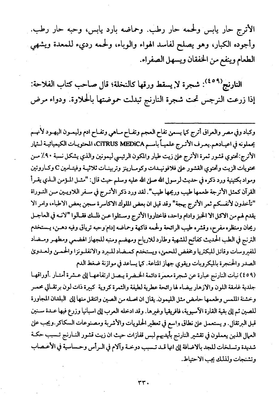 الأترج حار يابس ولحمه حار رطب. وحماضه بارد يابس، وحبه حار رطب. وأجوده الكبار، وهو يصلح لفاسد الهواء والوباء، ولحمه رديء للمعدة ويشهي الطعام وينفع من الخفقان ويسهل الصفراء.