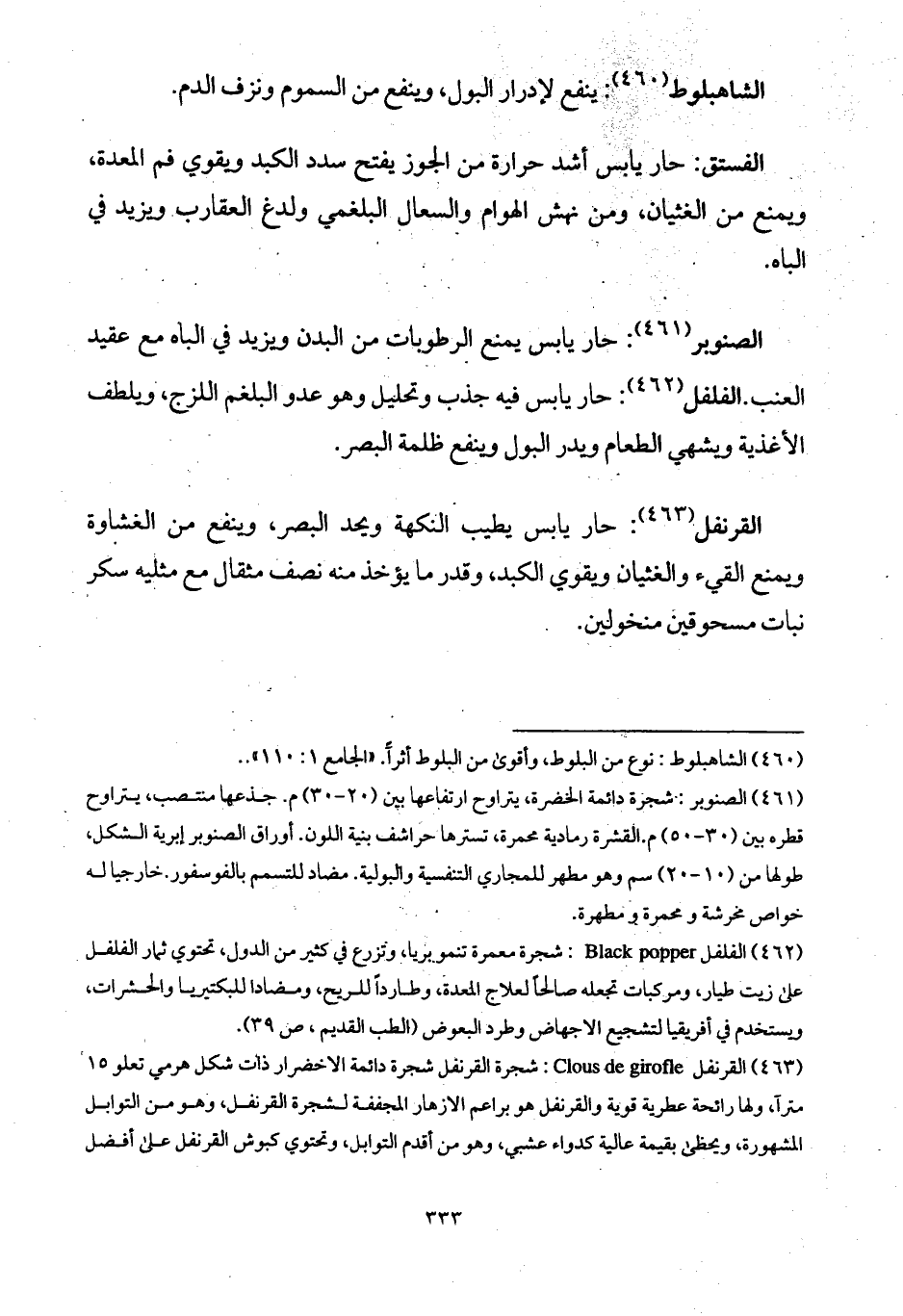 القرنفل: حار يابس يطيب النكهة ويحد البصر، وينفع من الغشاوة ويمنع القيء والغثيان ويقوي الكبد، وقدر ما يؤخذ منه نصف مثقال مع مثليه سكر نبات مسحوقين منخولين.