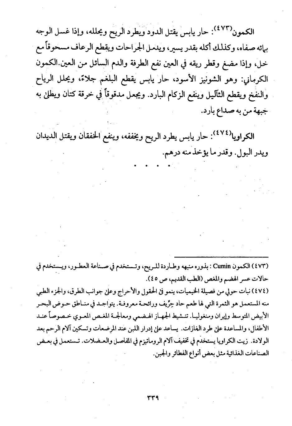 الكراويا: حار يابس يطرد الريح ويخففه، وينفع الخفقان ويقتل الديدان ويدر البول. وقدر ما يؤخذ منه درهم.