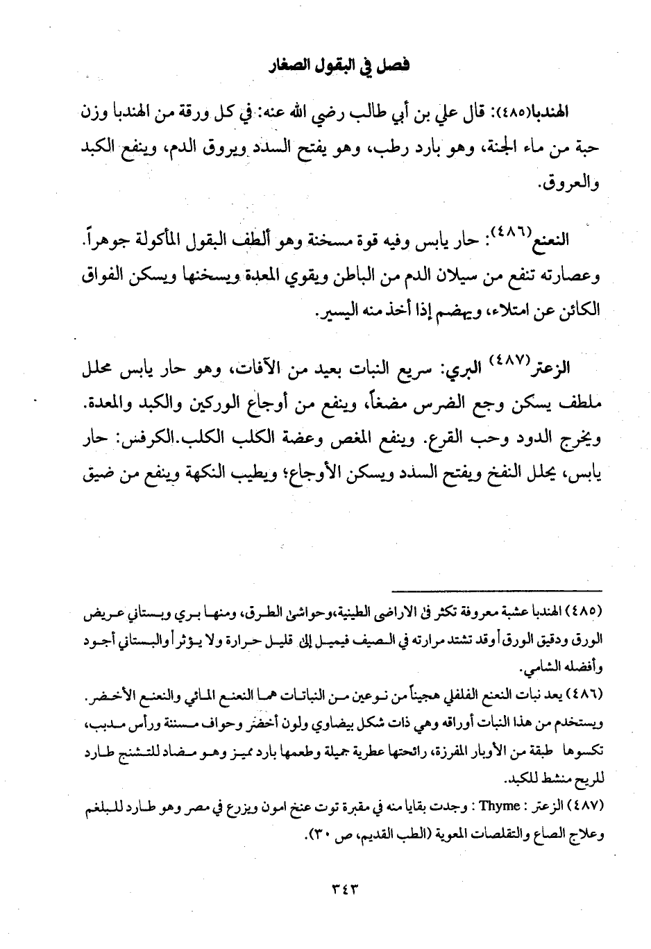 الهندبا: قال علي بن أبي طالب رضي الله عنه: في كل ورقة من الهندبا وزن حبة من ماء الجنة، وهو بارد رطب، وهو يفتح السدد ويروق الدم، وينفع الكبد والعروق.