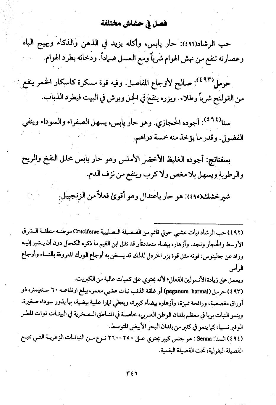 حرمل: صالح لأوجاع المفاصل. وفيه قوة مسكرة كاسكار الخمر ينفع من القولنح شرباً وطلاء. وبزره ينقع في الخل ويرش في البيت فيطرد الذباب.