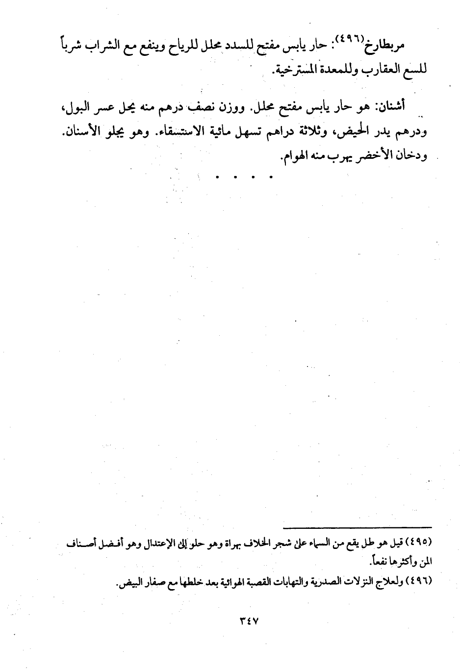 مربطارخ: حار يابس مفتح للسدد محلل للرياح وينفع مع الشراب شرباً للسع العقارب وللمعدة المسترخية.