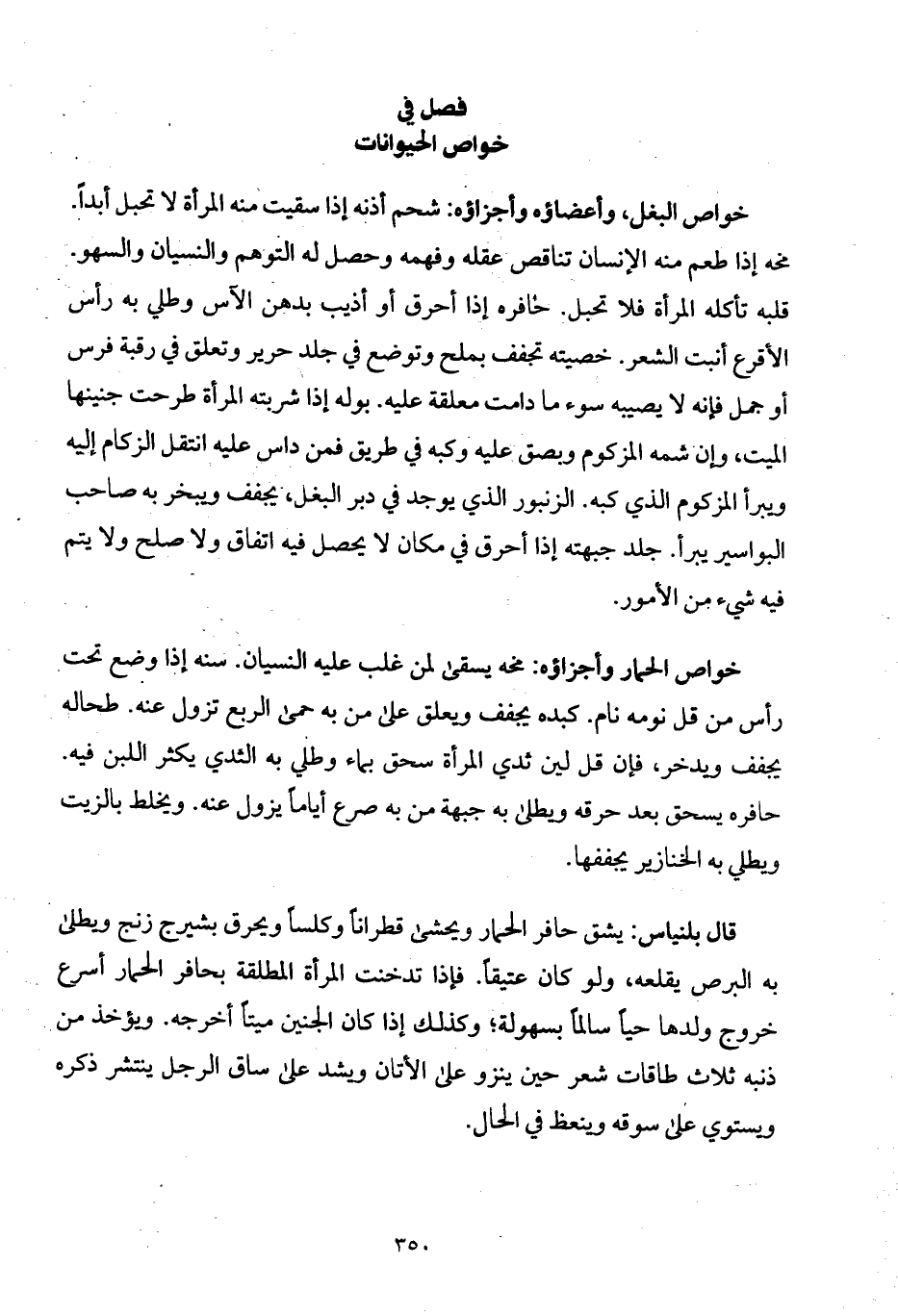 قال بلنياس: يشق حافر الحمار ويحشى قطراناً وكلساً ويحرق بشيرج زنج ويطلى به البرص يقلعه، ولو كان عتيقاً. فإذا تدخنت المرأة المطلقة بحافر الحمار أسرع خروج ولدها حياً سالماً بسهولة؛ وكذلك إذا كان الجنين ميتاً أخرجه. ويؤخذ من ذنبه ثلاث طاقات شعر حين ينزو على الأتان ويشد على ساق الرجل ينتشر ذكره ويستوي على سوقه وينعظ في الحال.