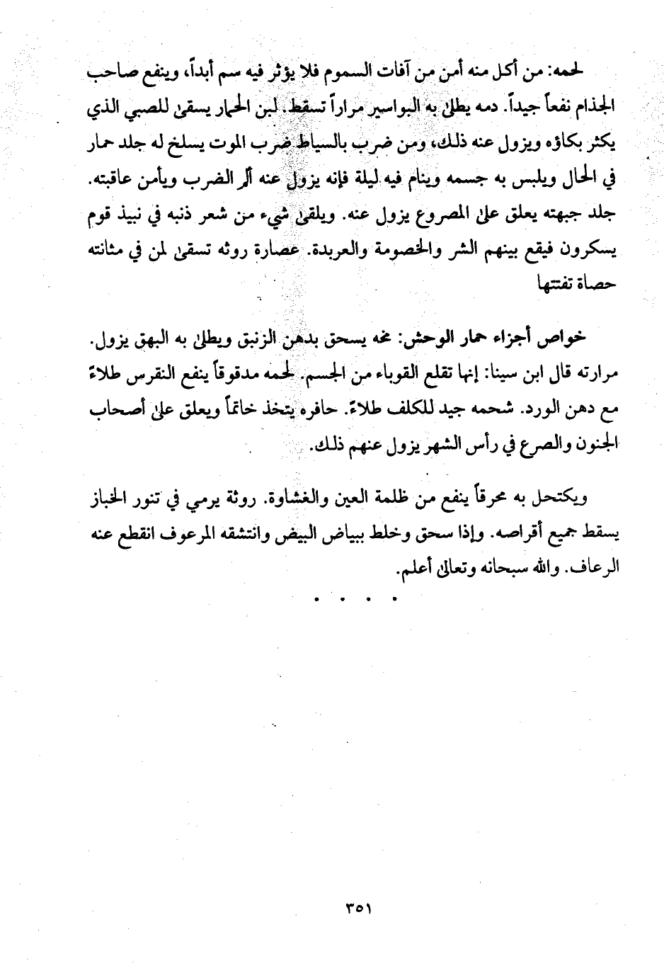 خواص أجزاء حمار الوحش: مخه يسحق بدهن الزنبق ويطلى به البهق يزول. مرارته قال ابن سينا: إنها تقلع القوباء من الجسم. لحمه مدقوقاً ينفع النقرس طلاءً مع دهن الورد. شحمه جيد للكلف طلاءً. حافره يتخذ خاتماً ويعلق على أصحاب الجنون والصرع في رأس الشهر يزول عنهم ذلك. ويكتحل به محرقاً ينفع من ظلمة العين والغشاوة. روثة يرمي في تنور الخباز يسقط جميع أقراصه. وإذا سحق وخلط ببياض البيض وانتشقه المرعوف انقطع عنه الرعاف. والله سبحانه وتعالى أعلم.