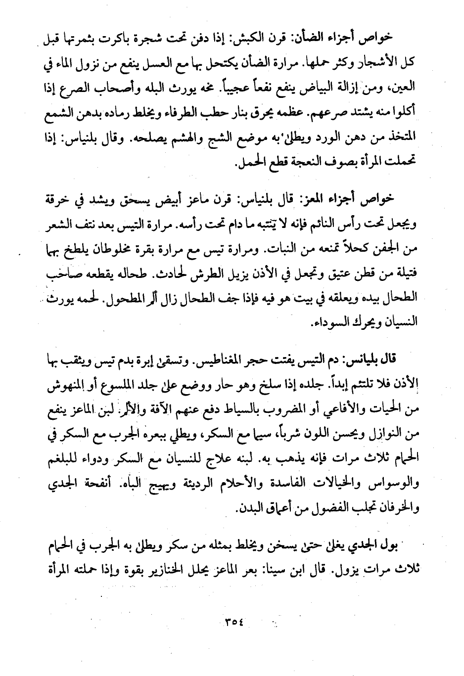 خواص أجزاء المعز: قال بلنياس: قرن ماعز أبيض يسحق ويشد في خرقة ويجعل تحت رأس النائم فإنه لا ينتبه ما دام تحت رأسه. مرارة التيس بعد نتف الشعر من الجفن كحلاً تمنعه من النبات. ومرارة تيس مع مرارة بقرة مخلوطان يلطخ بهما فتيلة من قطن عتيق وتجعل في الأذن يزيل الطرش لحادث. طحاله يقطعه صاحب الطحال بيده ويعلقه في بيت هو فيه فإذا جف الطحال زال ألم المطحول. لحمه يورث النسيان ويحرك السوداء. قال بليانس: دم التيس يفتت حجر المغناطيس. وتسقى إبرة بدم تيس ويثقب بها الأذن فلا تلتئم إبداً. جلده إذا سلخ وهو حار ووضع على جلد الملسوع أو المنهوش من الحيات والأفاعي أو المضروب بالسياط دفع عنهم الآفة والألم. لبن الماعز ينفع من النوازل ويحسن اللون شرباً، سيما مع السكر، ويطلي ببعره الجرب مع السكر في الحمام ثلاث مرات فإنه يذهب به. لبنه علاج للنسيان مع السكر ودواء للبلغم والوسواس والخيالات الفاسدة والأحلام الرديئة ويهيج الباه. أنفحة الجدي والخرفان تجلب الفضول من أعماق البدن. بول الجدي يغلى حتى يسخن ويخلط بمثله من سكر ويطلى به الجرب في الحمام ثلاث مرات يزول. قال ابن سينا: بعر الماعز يحلل الخنازير بقوة وإذا حملته المرأة