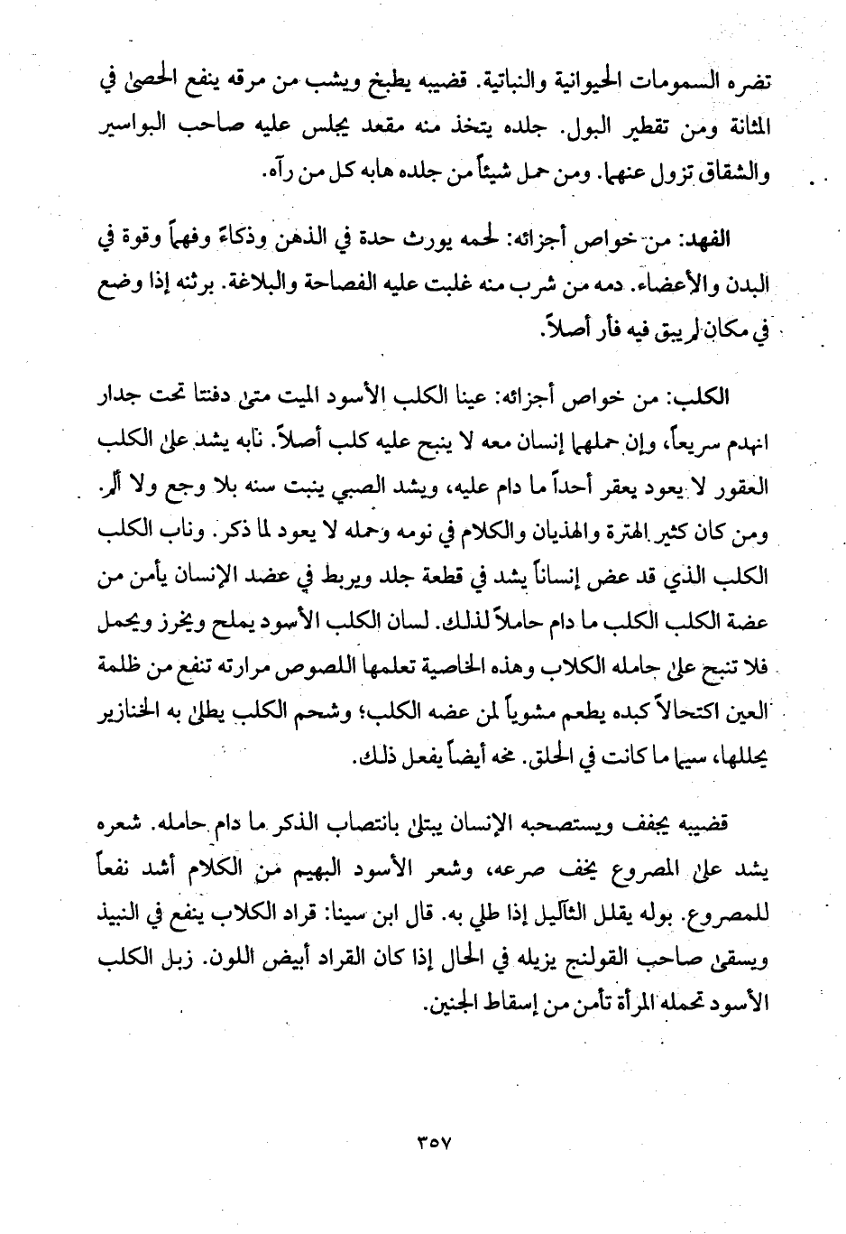 الكلب: من خواص أجزائه: عينا الكلب الأسود الميت متى دفنتا تحت جدار انهدم سريعاً، وإن حملهما إنسان معه لا ينبح عليه كلب أصلاً. نابه يشد على الكلب العقور لا يعود يعقر أحداً ما دام عليه، ويشد الصبي ينبت سنه بلا وجع ولا ألم. ومن كان كثير الهترة والهذيان والكلام في نومه وحمله لا يعود لما ذكر. وناب الكلب الكلب الذي قد عض إنساناً يشد في قطعة جلد ويربط في عضد الإنسان يأمن من عضة الكلب الكلب ما دام حاملاً لذلك. لسان الكلب الأسود يملح ويخرز ويحمل فلا تنبح على حامله الكلاب وهذه الخاصية تعلمها اللصوص مرارته تنفع من ظلمة العين اكتحالاً كبده يطعم مشوياً لمن عضه الكلب؛ وشحم الكلب يطلى به الخنازير يحللها، سيما ما كانت في الحلق. مخه أيضاً يفعل ذلك.