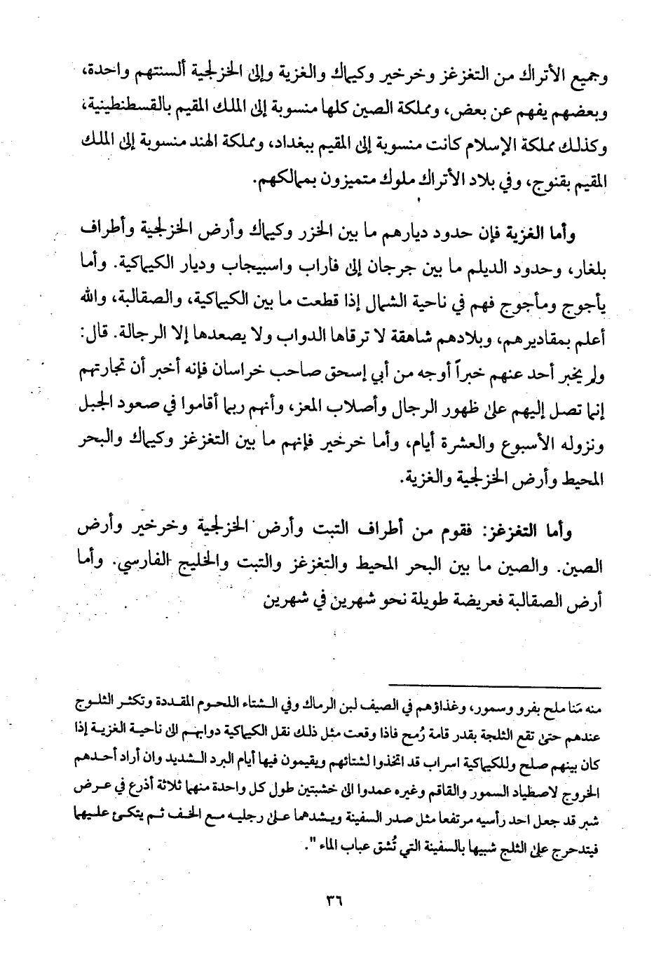 وجميع الأتراك من التغزغز وخرخير وكيماك والغزية وإلى الخزلجية ألسنتهم واحدة، وبعضهم يفهم عن بعض، ومملكة الصين كلها منسوبة إلى الملك المقيم بالقسطنطينية، وكذلك مملكة الإسلام كانت منسوبة إلى المقيم ببغداد، ومملكة الهند منسوبة إلى الملك المقيم بقنوج، وفي بلاد الأتراك ملوك متميزون بممالكهم.