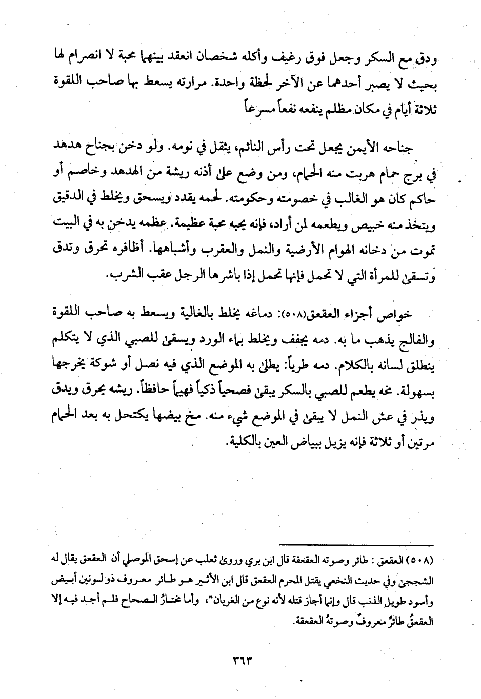 ودق مع السكر وجعل فوق رغيف وأكله شخصان انعقد بينهما محبة لا انصرام لها بحيث لا يصبر أحدهما عن الآخر لحظة واحدة. مرارته يسعط بها صاحب اللقوة ثلاثة أيام في مكان مظلم ينفعه نفعاً مسرعاً.