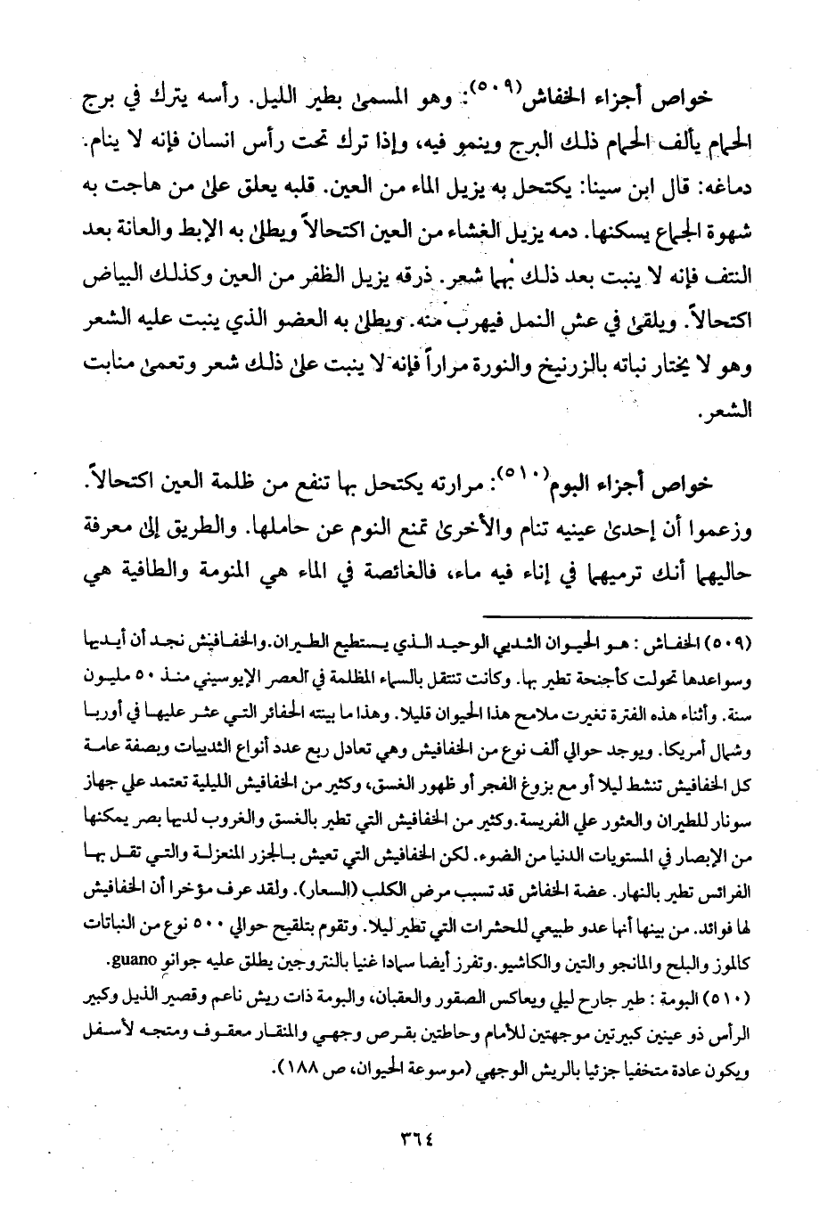 خواص أجزاء الخفاش: وهو المسمى بطير الليل. رأسه يترك في برج الحمام يألف الحمام ذلك البرج وينمو فيه، وإذا ترك تحت رأس انسان فإنه لا ينام. دماغه: قال ابن سينا: يكتحل به يزيل الماء من العين. قلبه يعلق على من هاجت به شهوة الجماع يسكنها. دمه يزيل الغشاء من العين اكتحالاً ويطلى به الإبط والعانة بعد النتف فإنه لا ينبت بعد ذلك بهما شعر. ذرقه يزيل الظفر من العين وكذلك البياض اكتحالاً. ويلقى في عش النمل فيهرب منه. ويطلى به العضو الذي ينبت عليه الشعر وهو لا يختار نباته بالزرنيخ والنورة مراراً فإنه لا ينبت على ذلك شعر وتعمى منابت الشعر.