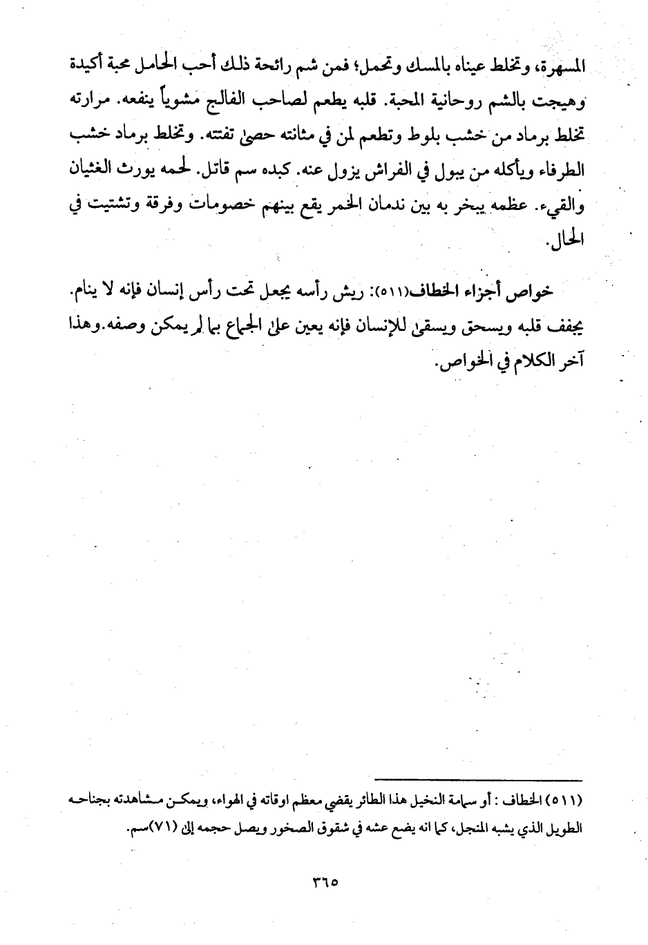 خواص أجزاء الخطاف: ريش رأسه يجعل تحت رأس إنسان فإنه لا ينام. يجفف قلبه ويسحق ويسقى للإنسان فإنه يعين على الجماع بما لم يمكن وصفه.