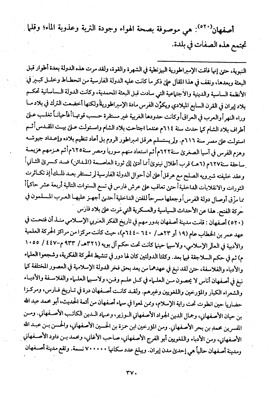 أصفهان: هي موصوفة بصحة الهواء وجودة التربة وعذوبة الماء؛ وقلما تجتمع هذه الصفات في بلدة.