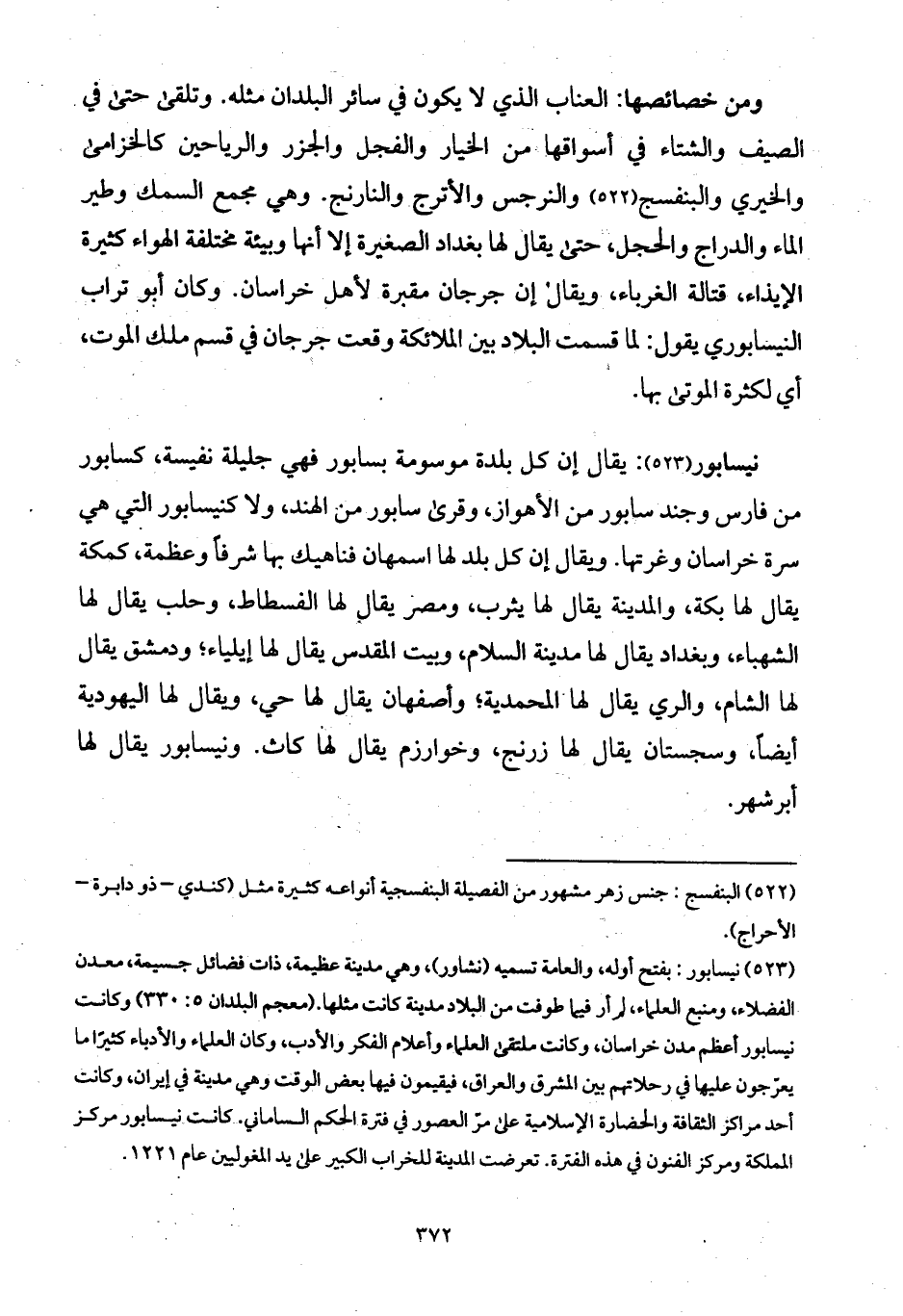 نيسابور: يقال إن كل بلدة موسومة بسابور فهي جليلة نفيسة، كسابور من فارس وجند سابور من الأهواز، وقرى سابور من الهند، ولا كنيسابور التي هي سرة خراسان وغرتها. ويقال إن كل بلد لها اسمهان فناهيك بها شرفاً وعظمة، كمكة يقال لها بكة، والمدينة يقال لها يثرب، ومصر يقال لها الفسطاط، وحلب يقال لها الشهباء، وبغداد يقال لها مدينة السلام، وبيت المقدس يقال لها إيلياء؛ ودمشق يقال لها الشام، والري يقال لها المحمدية؛ وأصفهان يقال لها حي، ويقال لها اليهودية أيضاً، وسجستان يقال لها زرنج، وخوارزم يقال لها كاث. ونيسابور يقال لها أبرشهر.