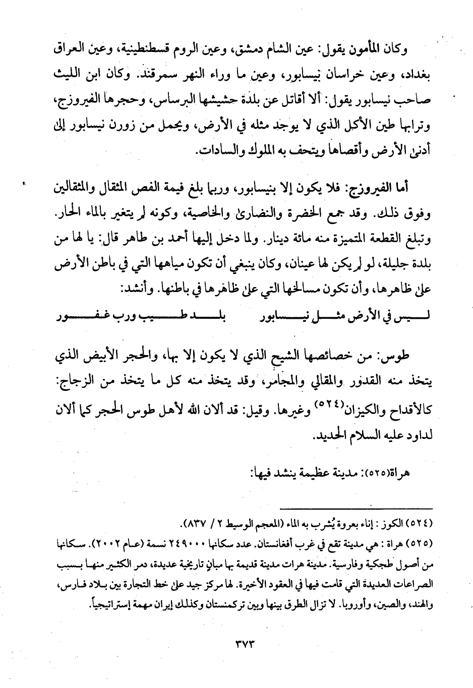وكان المأمون يقول: عين الشام دمشق، وعين الروم قسطنطينية، وعين العراق بغداد، وعين خراسان نيسابور، وعين ما وراء النهر سمرقند. وكان ابن الليث صاحب نيسابور يقول: ألا أقاتل عن بلدة حشيشها البرساس، وحجرها الفيروزج، وترابها طين الأكل الذي لا يوجد مثله في الأرض، ويحمل من زورن نيسابور إلى أدنى الأرض وأقصاها ويتحف به الملوك والسادات.