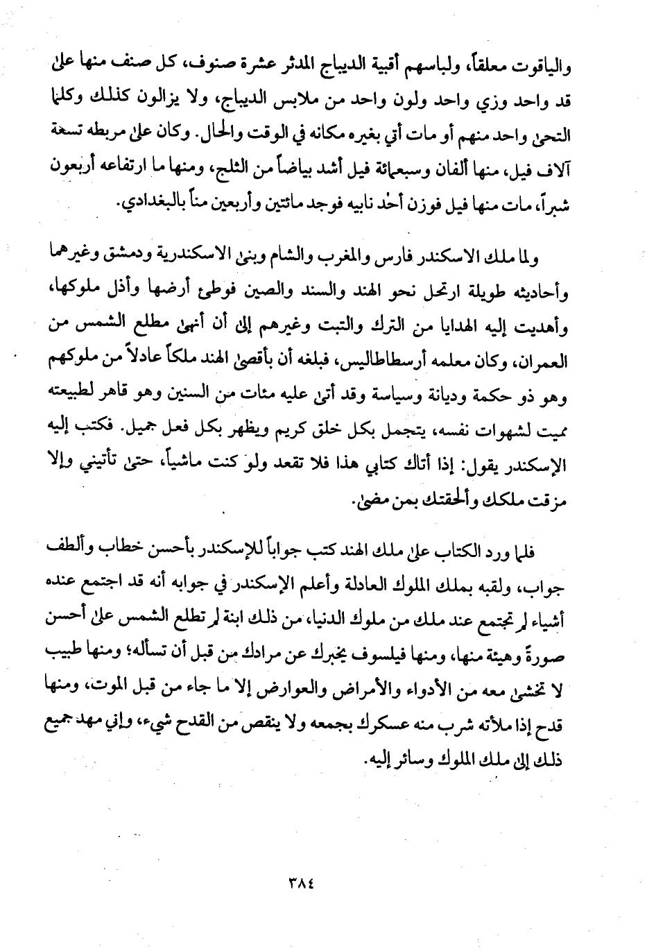 فلما ورد الكتاب على ملك الهند كتب جواباً للإسكندر بأحسن خطاب وألطف جواب، ولقبه بملك الملوك العادلة وأعلم الإسكندر في جوابه أنه قد اجتمع عنده أشياء لم تجتمع عند ملك من ملوك الدنيا، من ذلك ابنة لم تطلع الشمس على أحسن صورةً وهيئة منها، ومنها فيلسوف يخبرك عن مرادك من قبل أن تسأله؛ ومنها طبيب لا تخشى معه من الأدواء والأمراض والعوارض إلا ما جاء من قبل الموت، ومنها قدح إذا ملأته شرب منه عسكرك بجمعه ولا ينقص من القدح شيء، وإني مهد جميع ذلك إلى ملك الملوك وسائر إليه.