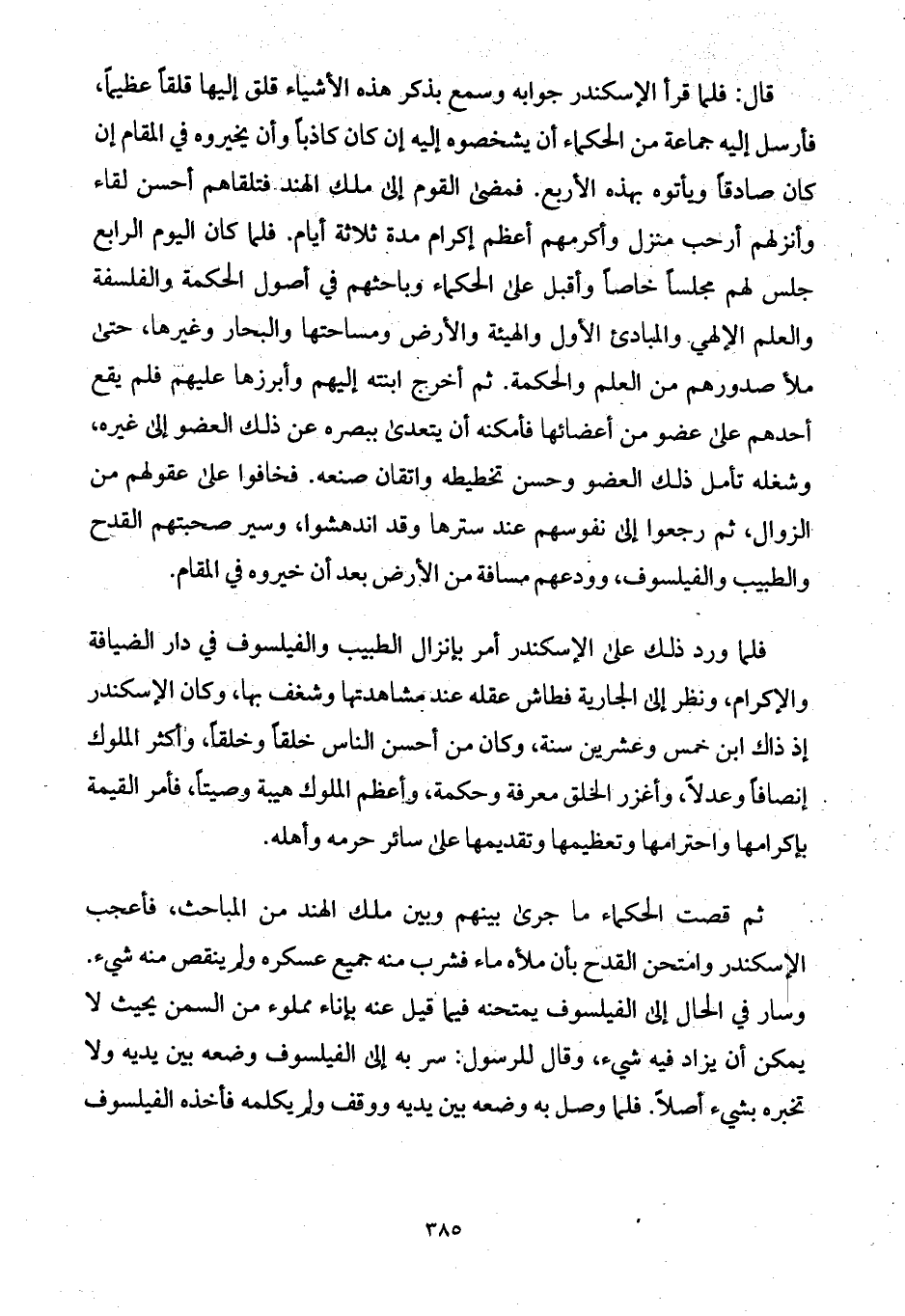 قال: فلما قرأ الإسكندر جوابه وسمع بذكر هذه الأشياء قلق إليها قلقاً عظيماً، فأرسل إليه جماعة من الحكماء أن يشخصوه إليه إن كان كاذباً وأن يخيروه في المقام إن كان صادقاً ويأتوه بهذه الأربع. فمضى القوم إلى ملك الهند فتلقاهم أحسن لقاء وأنزلهم أرحب منزل وأكرمهم أعظم إكرام مدة ثلاثة أيام. فلما كان اليوم الرابع جلس لهم مجلساً خاصاً وأقبل على الحكماء وباحثهم في أصول الحكمة والفلسفة والعلم الإلهي والمبادئ الأول والهيئة والأرض ومساحتها والبحار وغيرها، حتى ملأ صدورهم من العلم والحكمة. ثم أخرج ابنته إليهم وأبرزها عليهم فلم يقع أحدهم على عضو من أعضائها فأمكنه أن يتعدى ببصره عن ذلك العضو إلى غيره، وشغله تأمل ذلك العضو وحسن تخطيطه واتقان صنعه. فخافوا على عقولهم من الزوال، ثم رجعوا إلى نفوسهم عند سترها وقد اندهشوا، وسير صحبتهم القدح والطبيب والفيلسوف، وودعهم مسافة من الأرض بعد أن خيروه في المقام.