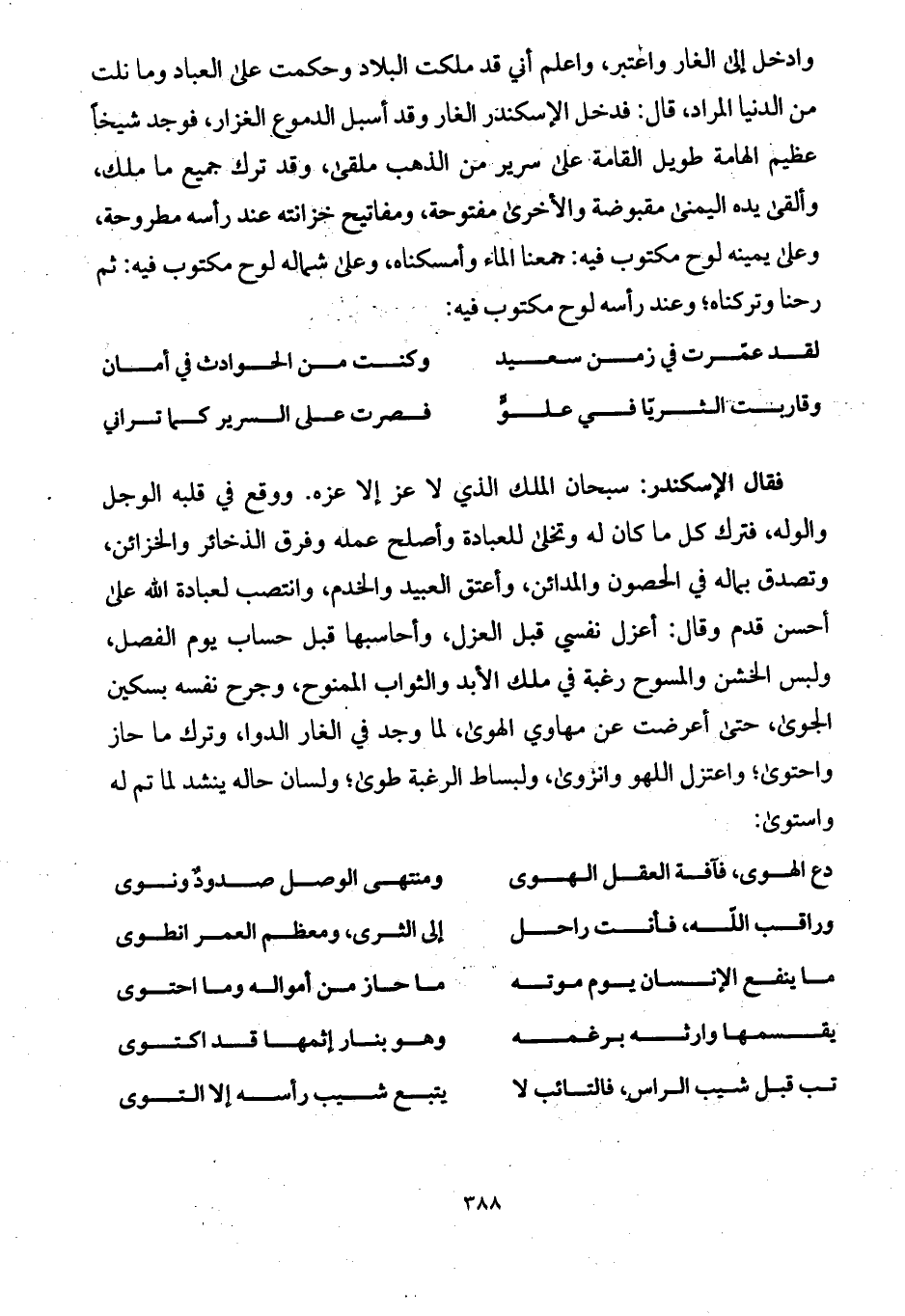 فقال الإسكندر: سبحان الملك الذي لا عز إلا عزه. ووقع في قلبه الوجل والوله، فترك كل ما كان له وتخلى للعبادة وأصلح عمله وفرق الذخائر والخزائن، وتصدق بماله في الحصون والمدائن، وأعتق العبيد والخدم، وانتصب لعبادة الله على أحسن قدم وقال: أعزل نفسي قبل العزل، وأحاسبها قبل حساب يوم الفصل، ولبس الخشن والمسوح رغبة في ملك الأبد والثواب الممنوح، وجرح نفسه بسكين الجوى، حتى أعرضت عن مهاوي الهوى، لما وجد في الغار الدوا، وترك ما حاز واحتوى؛ واعتزل اللهو وانزوى، ولبساط الرغبة طوى؛ ولسان حاله ينشد لما تم له واستوى: