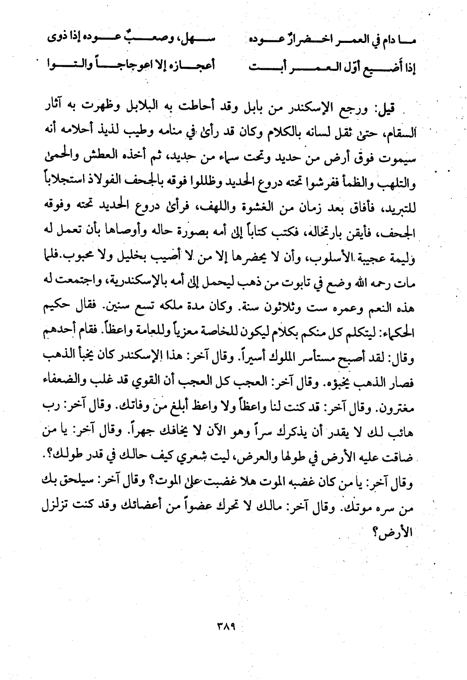 فلما مات رحمه الله وضع في تابوت من ذهب ليحمل إلى أمه بالإسكندرية، واجتمعت له هذه النعم وعمره ست وثلاثون سنة. وكان مدة ملكه تسع سنين. فقال حكيم الحكماء: ليتكلم كل منكم بكلام ليكون للخاصة معزياً وللعامة واعظاً. فقام أحدهم وقال: لقد أصبح مستأسر الملوك أسيراً. وقال آخر: هذا الإسكندر كان يخبأ الذهب فصار الذهب يخبؤه. وقال آخر: العجب كل العجب أن القوي قد غلب والضعفاء مغترون. وقال آخر: قد كنت لنا واعظاً ولا واعظ أبلغ من وفاتك. وقال آخر: رب هائب لك لا يقدر أن يذكرك سراً وهو الآن لا يخافك جهراً. وقال آخر: يا من ضاقت عليه الأرض في طولها والعرض، ليت شعري كيف حالك في قدر طولك؟. وقال آخر: يا من كان غضبه الموت هلا غضبت على الموت؟ وقال آخر: سيلحق بك من سره موتك. وقال آخر: مالك لا تحرك عضواً من أعضائك وقد كنت تزلزل الأرض؟