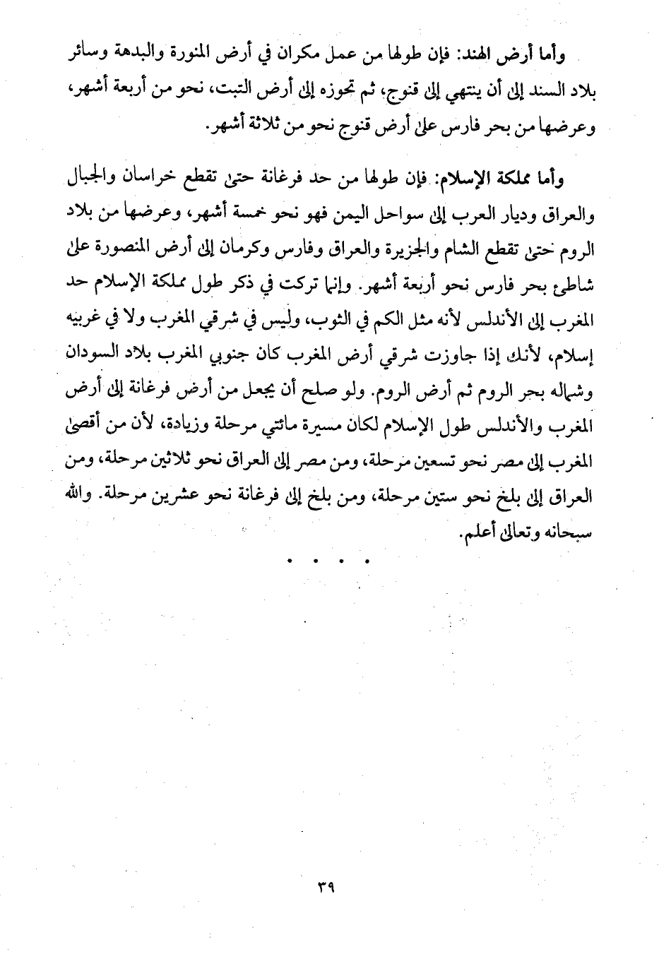 وأما مملكة الإسلام: فإن طولها من حد فرغانة حتى تقطع خراسان والجبال والعراق وديار العرب إلى سواحل اليمن فهو نحو خمسة أشهر، وعرضها من بلاد الروم حتى تقطع الشام والجزيرة والعراق وفارس وكرمان إلى أرض المنصورة على شاطئ بحر فارس نحو أربعة أشهر. وإنما تركت في ذكر طول مملكة الإسلام حد المغرب إلى الأندلس لأنه مثل الكم في الثوب، وليس في شرقي المغرب ولا في غربيه إسلام، لأنك إذا جاوزت شرقي أرض المغرب كان جنوبي المغرب بلاد السودان وشماله بحر الروم ثم أرض الروم. ولو صلح أن يجعل من أرض فرغانة إلى أرض المغرب والأندلس طول الإسلام لكان مسيرة مائتي مرحلة وزيادة، لأن من أقصى المغرب إلى مصر نحو تسعين مرحلة، ومن مصر إلى العراق نحو ثلاثين مرحلة، ومن العراق إلى بلخ نحو ستين مرحلة، ومن بلخ إلى فرغانة نحو عشرين مرحلة. والله سبحانه وتعالى أعلم.