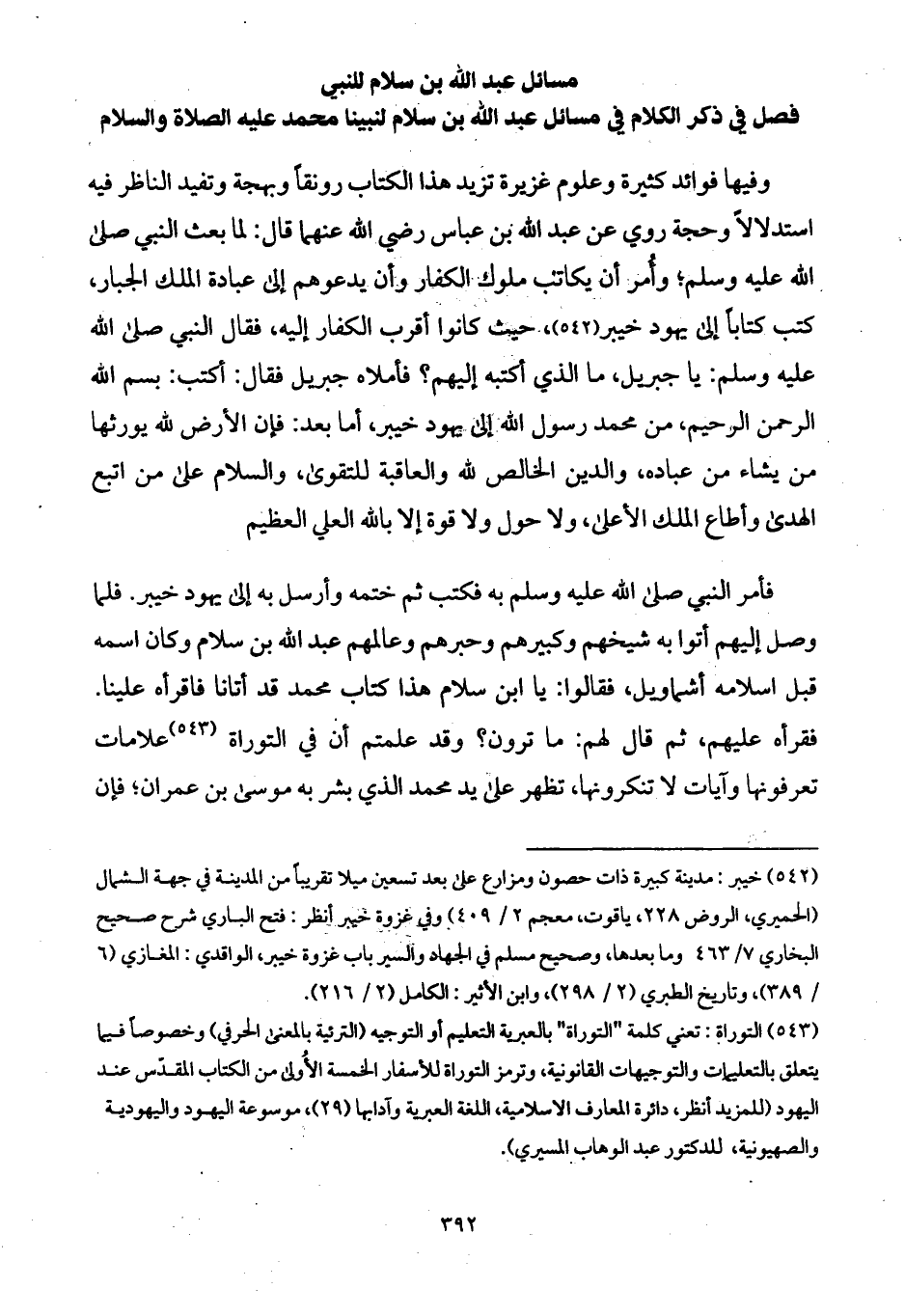 وفيها فوائد كثيرة وعلوم غزيرة تزيد هذا الكتاب رونقاً وبهجة وتفيد الناظر فيه استدلالاً وحجة روي عن عبد الله بن عباس رضي الله عنهما قال: لما بعث النبي صلى الله عليه وسلم؛ وأُمر أن يكاتب ملوك الكفار وأن يدعوهم إلى عبادة الملك الجبار، كتب كتاباً إلى يهود خيبر، حيث كانوا أقرب الكفار إليه، فقال النبي صلى الله عليه وسلم: يا جبريل، ما الذي أكتبه إليهم؟ فأملاه جبريل فقال: أكتب: بسم الله الرحمن الرحيم، من محمد رسول الله إلى يهود خيبر، أما بعد: فإن الأرض لله يورثها من يشاء من عباده، والدين الخالص لله والعاقبة للتقوى، والسلام على من اتبع الهدى وأطاع الملك الأعلى، ولا حول ولا قوة إلا بالله العلي العظيم.