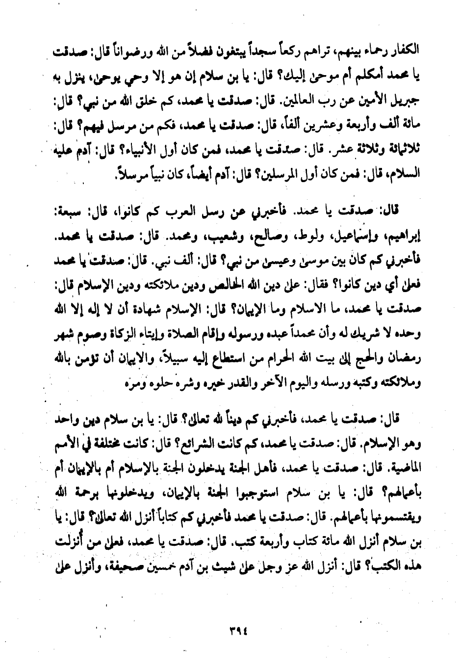 قال: صدقت يا محمد، فأخبرني كم ديناً لله تعالى؟ قال: يا بن سلام دين واحد وهو الإسلام. قال: صدقت يا محمد، كم كانت الشرائع؟ قال: كانت مختلفة في الأمم الماضية. قال: صدقت يا محمد، فأهل الجنة يدخلون الجنة بالإسلام أم بالإيمان أم بأعمالهم؟ قال: يا بن سلام استوجبوا الجنة بالإيمان، ويدخلونها برحمة الله ويقتسمونها بأعمالهم. قال: صدقت يا محمد فأخبرني كم كتاباً أنزل الله تعالى؟ قال: يا بن سلام أنزل الله مائة كتاب وأربعة كتب. قال: صدقت يا محمد، فعلى من أُنزلت هذه الكتب؟ قال: أنزل الله عز وجل على شيث بن آدم خمسين صحيفة، وأنزل على