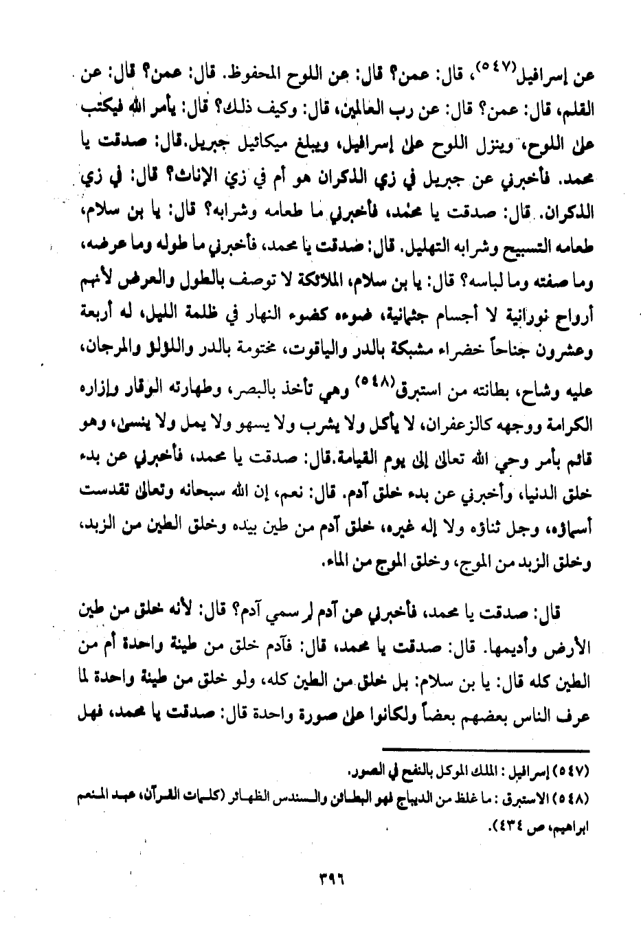 قال: صدقت يا محمد. فأخبرني عن جبريل في زي الذكران هو أم في زي الإناث؟ قال: في زي الذكران. قال: صدقت يا محمد، فأخبرني ما طعامه وشرابه؟ قال: يا بن سلام، طعامه التسبيح وشرابه التهليل. قال: صدقت يا محمد، فأخبرني ما طوله وما عرضه، وما صفته وما لباسه؟ قال: يا بن سلام، الملائكة لا توصف بالطول والعرض لأنهم أرواح نورانية لا أجسام جثمانية، ضوءه كضوء النهار في ظلمة الليل، له أربعة وعشرون جناحاً خضراء مشبكة بالدر والياقوت، مختومة بالدر واللؤلؤ والمرجان، عليه وشاح، بطانته من استبرق وهي تأخذ بالبصر، وطهارته الوقار وإزاره الكرامة ووجهه كالزعفران، لا يأكل ولا يشرب ولا يسهو ولا يمل ولا ينسى، وهو قائم بأمر وحي الله تعالى إلى يوم القيامة.