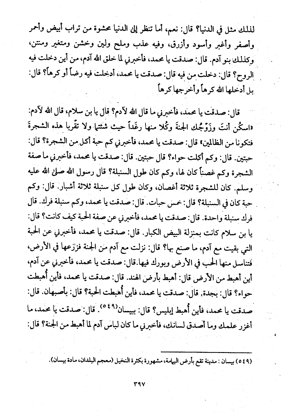 قال: صدقت يا محمد، فأخبرني عن آدم، أين أهبط من الأرض قال: أهبط بأرض الهند. قال: صدقت يا محمد، فأين أُهبطت حواء؟ قال: بجدة. قال: صدقت يا محمد، فأين أُهبطت الحبة؟ قال: بأصبهان. قال: صدقت يا محمد، فأين أُهبط إبليس؟ قال: ببيسان. قال: صدقت يا محمد، ما أغزر علمك وما أصدق لسانك، فأخبرني ما كان لباس آدم لما أهبط من الجنة؟ قال: