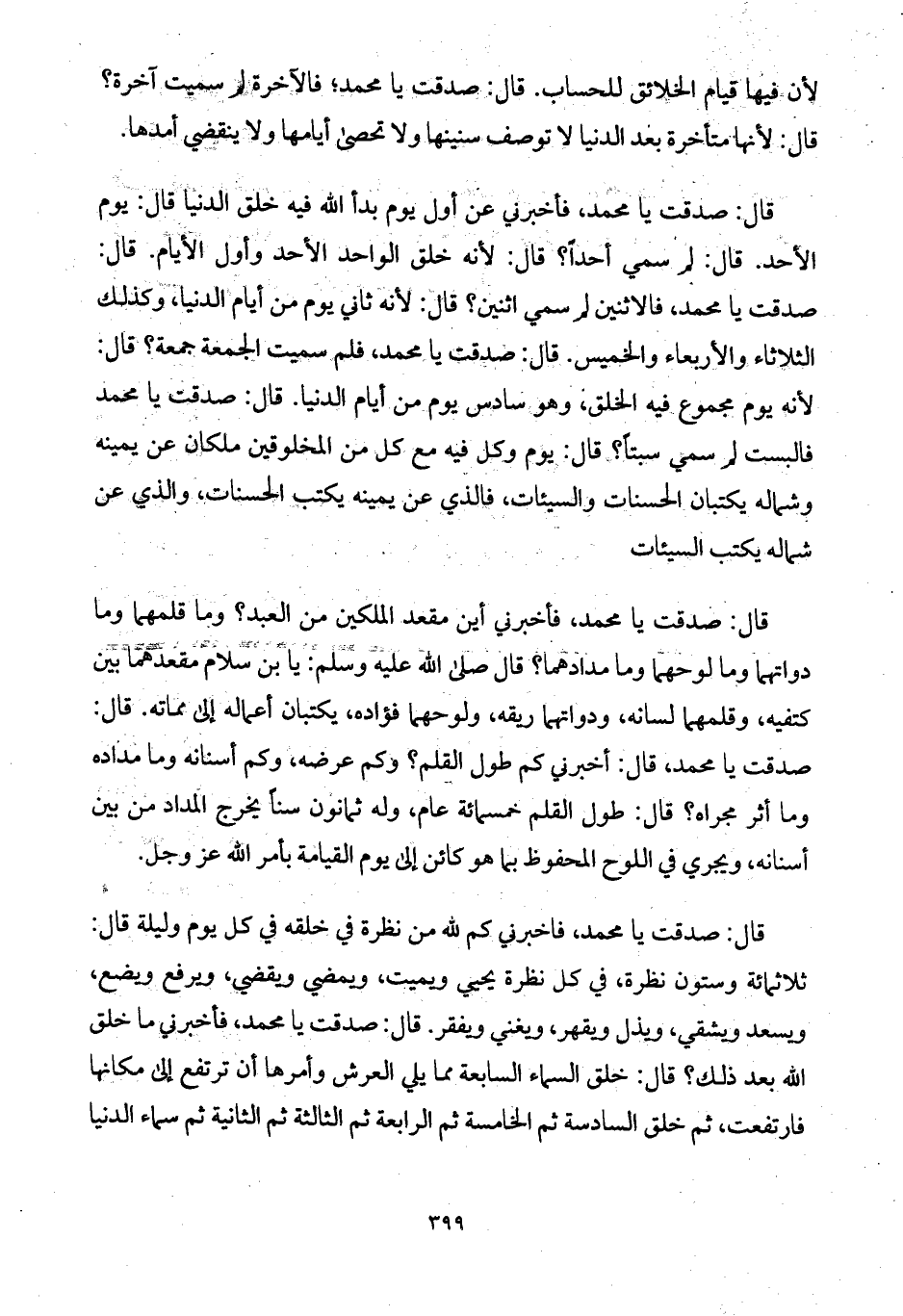 قال: صدقت يا محمد، فأخبرني عن أول يوم بدأ الله فيه خلق الدنيا قال: يوم الأحد. قال: لم سمي أحداً؟ قال: لأنه خلق الواحد الأحد وأول الأيام. قال: صدقت يا محمد، فالاثنين لم سمي اثنين؟ قال: لأنه ثاني يوم من أيام الدنيا، وكذلك الثلاثاء والأربعاء والخميس. قال: صدقت يا محمد، فلم سميت الجمعة جمعة؟ قال: لأنه يوم مجموع فيه الخلق، وهو سادس يوم من أيام الدنيا. قال: صدقت يا محمد فالبست لم سمي سبتاً؟ قال: يوم وكل فيه مع كل من المخلوقين ملكان عن يمينه وشماله يكتبان الحسنات والسيئات، فالذي عن يمينه يكتب الحسنات، والذي عن شماله يكتب السيئات.