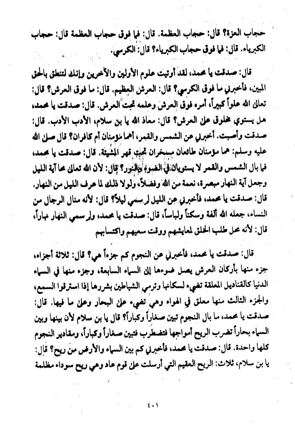 قال: صدقت يا محمد، لقد أوتيت علوم الأولين والآخرين وإنك لتنطق بالحق المبين، فأخبرني ما فوق الكرسي؟ قال: العرش العظيم. قال: ما فوق العرش؟ قال: تعالى الله علواً كبيراً، أمره فوق العرش وعلمه تحت العرش. قال: صدقت يا محمد، هل يستوي مخلوق على العرش؟ قال: معاذ الله يا بن سلام، الأدب الأدب. قال: صدقت وأصبت. أخبرني عن الشمس والقمر، أهما مؤمنان أم كافران؟ قال صلى الله عليه وسلم: هما مؤمنان طائعان مسخران تحت قهر المشيئة. قال: صدقت يا محمد، فما بال الشمس والقمر لا يستويان في الضوء والنور؟ قال: لأن الله تعالى محا آية الليل وجعل آية النهار مبصرة، نعمة من الله وفضلاً، ولولا ذلك لما عرف الليل من النهار. قال: صدقت يا محمد، فأخبرني عن الليل لم سمي ليلاً؟ قال: لأنه منال الرجال من النساء، جعله الله ألفة وسكناً ولباساً، قال: صدقت يا محمد، ولم سمي النهار نهاراً، قال: لأنه محل طلب الخلق لمعايشهم ووقت سعيهم واكتسابهم.