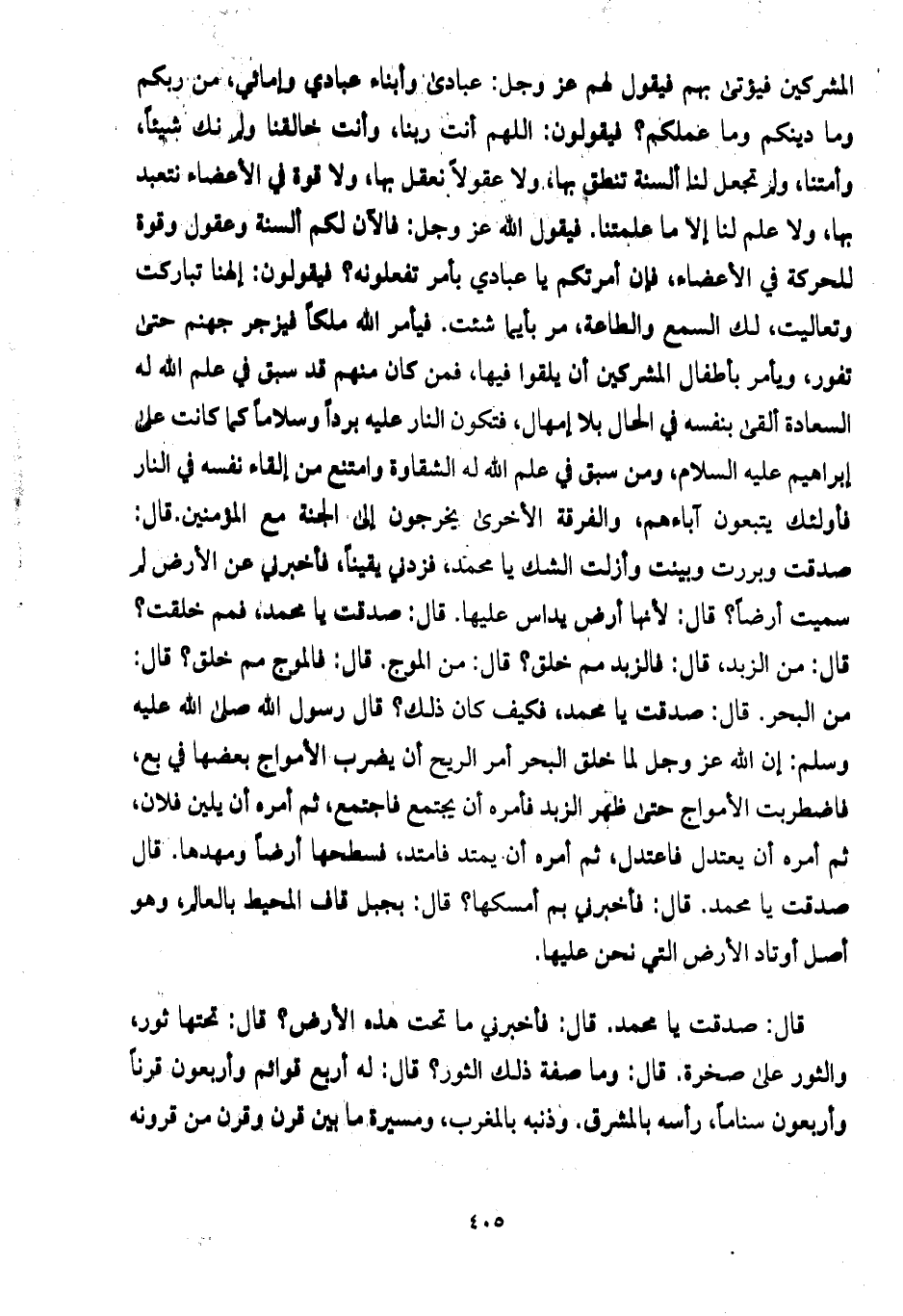 قال: صدقت وبررت وبينت وأزلت الشك يا محمد، فزدني يقيناً، فأخبرني عن الأرض لم سميت أرضاً؟ قال: لأنها أرض يداس عليها. قال: صدقت يا محمد، فمم خلقت؟ قال: من الزبد، قال: فالزبد مم خلق؟ قال: من الموج. قال: فالموج مم خلق؟ قال: من البحر. قال: صدقت يا محمد، فكيف كان ذلك؟ قال رسول الله صلى الله عليه وسلم: إن الله عز وجل لما خلق البحر أمر الريح أن يضرب الأمواج بعضها في بع، فاضطربت الأمواج حتى ظهر الزبد فأمره أن يجتمع فاجتمع، ثم أمره أن يلين فلان، ثم أمره أن يعتدل فاعتدل، ثم أمره أن يمتد فامتد، فسطحها أرضاً ومهدها. قال صدقت يا محمد. قال: فأخبرني بم أمسكها؟ قال: بجبل قاف المحيط بالعالم، وهو أصل أوتاد الأرض التي نحن عليها.
