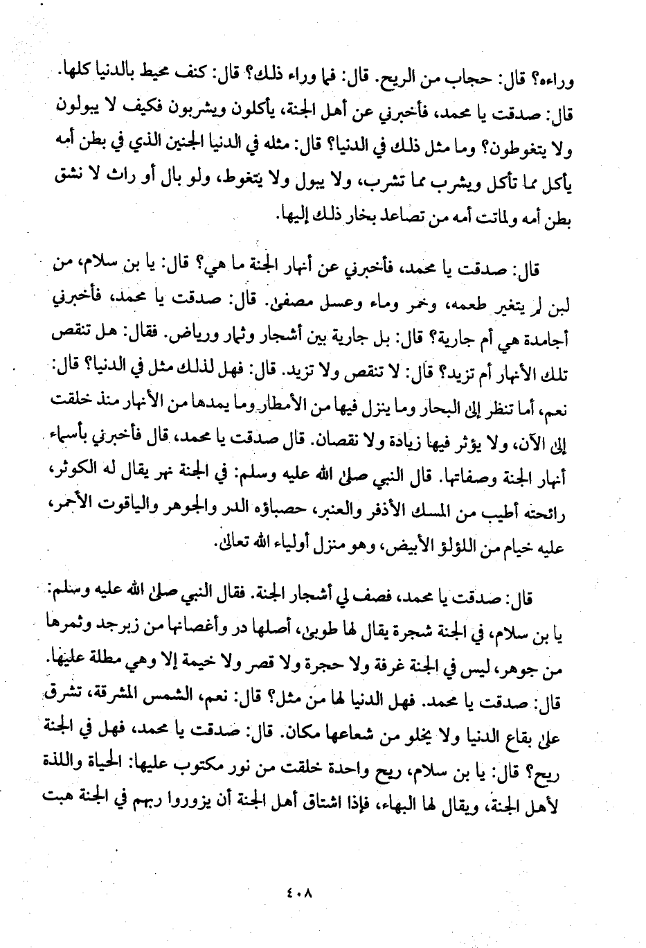 قال: صدقت يا محمد، فأخبرني عن أنهار الجنة ما هي؟ قال: يا بن سلام، من لبن لم يتغير طعمه، وخمر وماء وعسل مصفى. قال: صدقت يا محمد، فأخبرني أجامدة هي أم جارية؟ قال: بل جارية بين أشجار وثمار ورياض. فقال: هل تنقص تلك الأنهار أم تزيد؟ قال: لا تنقص ولا تزيد. قال: فهل لذلك مثل في الدنيا؟ قال: نعم، أما تنظر إلى البحار وما ينزل فيها من الأمطار وما يمدها من الأنهار منذ خلقت إلى الآن، ولا يؤثر فيها زيادة ولا نقصان. قال صدقت يا محمد، قال فأخبرني بأسماء أنهار الجنة وصفاتها. قال النبي صلى الله عليه وسلم: في الجنة نهر يقال له الكوثر، رائحته أطيب من المسك الأذفر والعنبر، حصباؤه الدر والجوهر والياقوت الأحمر، عليه خيام من اللؤلؤ الأبيض، وهو منزل أولياء الله تعالى.