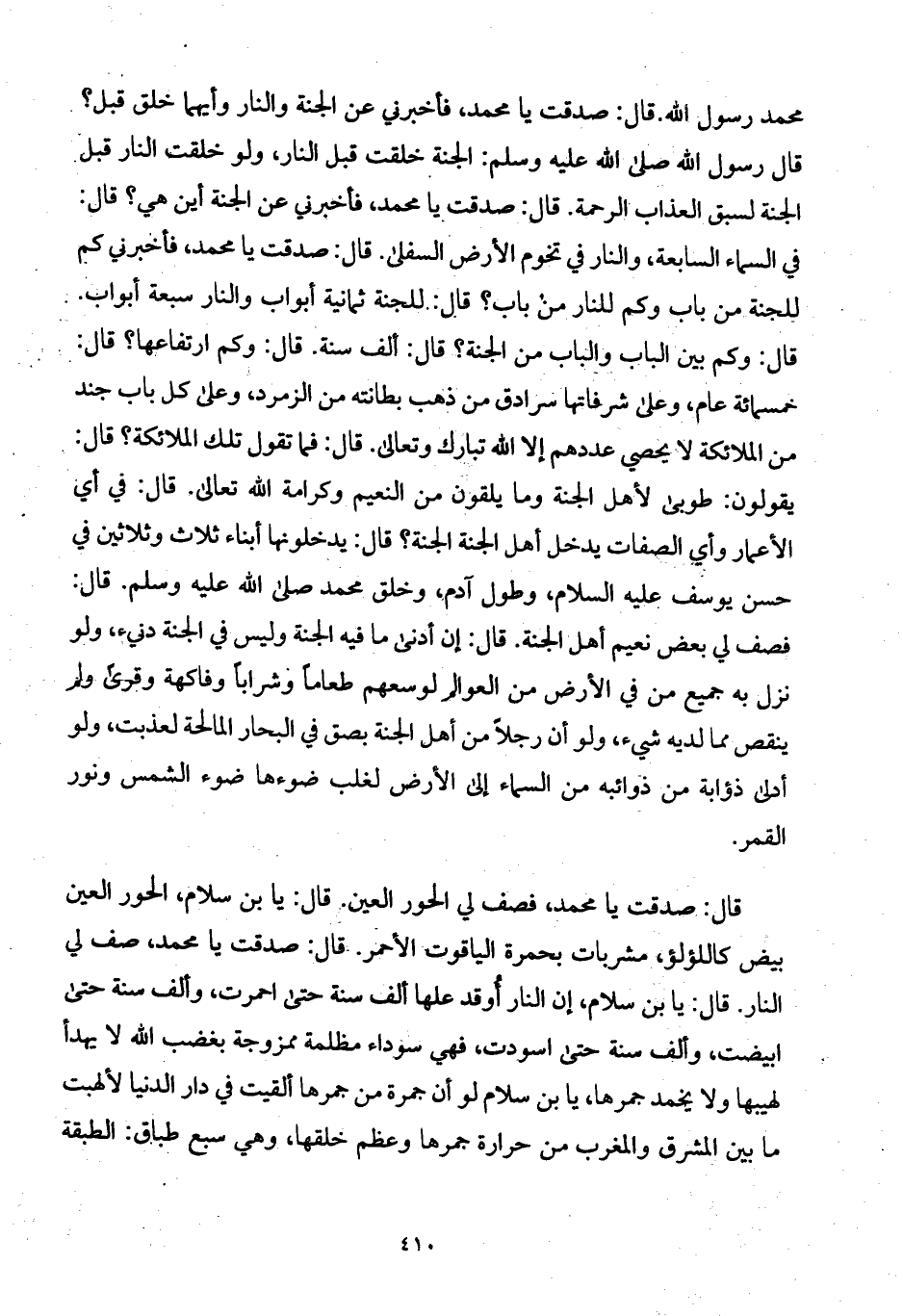 قال: صدقت يا محمد، فصف لي الحور العين. قال: يا بن سلام، الحور العين بيض كاللؤلؤ، مشربات بحمرة الياقوت الأحمر. قال: صدقت يا محمد، صف لي النار. قال: يا بن سلام، إن النار أُوقد علها ألف سنة حتى احمرت، وألف سنة حتى ابيضت، وألف سنة حتى اسودت، فهي سوداء مظلمة ممزوجة بغضب الله لا يهدأ لهيبها ولا يخمد جمرها، يا بن سلام لو أن جمرة من جمرها ألقيت في دار الدنيا لألهبت ما بين المشرق والمغرب من حرارة جمرها وعظم خلقها، وهي سبع طباق: الطبقة