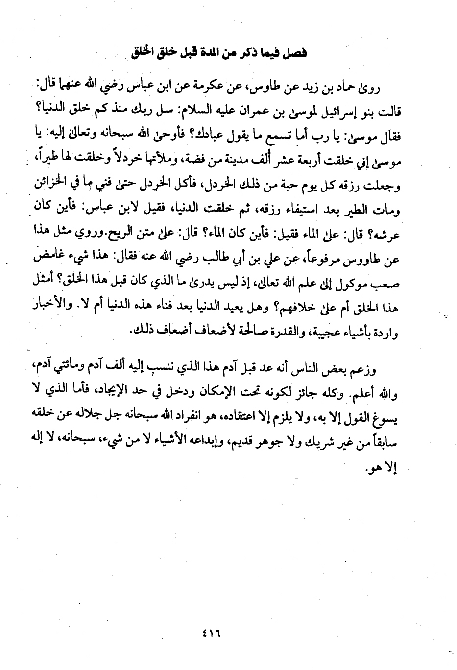 وزعم بعض الناس أنه عد قبل آدم هذا الذي ننسب إليه ألف آدم ومائتي آدم، والله أعلم. وكله جائز لكونه تحت الإمكان ودخل في حد الإيجاد، فأما الذي لا يسوغ القول إلا به، ولا يلزم إلا اعتقاده، هو انفراد الله سبحانه جل جلاله عن خلقه سابقاً من غير شريك ولا جوهر قديم، وإبداعه الأشياء لا من شيء، سبحانه، لا إله إلا هو.