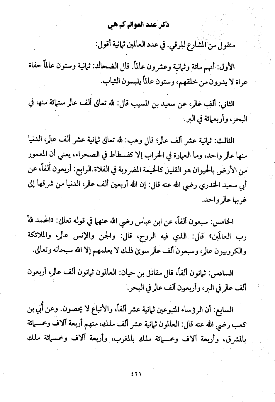 الخامس: سبعون ألفاً، عن ابن عباس رضي الله عنهما في قوله تعالى: " الحمد لله رب العالَمين " قال: الذي فيه الروح، قال: والجن والإنس عالم، والملائكة والكروبيون عالم، وسبعون ألف عالم سوى ذلك لا يعلمهم إلا الله سبحانه وتعالى.