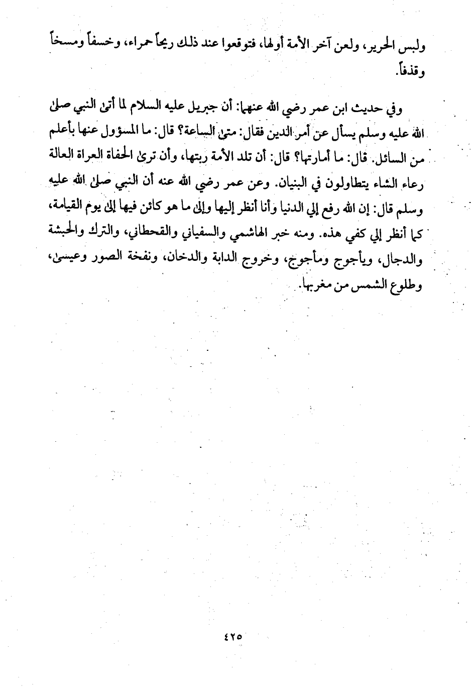 وفي حديث ابن عمر رضي الله عنهما: أن جبريل عليه السلام لما أتى النبي صلى الله عليه وسلم يسأل عن أمر الدين فقال: متى الساعة؟ قال: ما المسؤول عنها بأعلم من السائل. قال: ما أمارتها؟ قال: أن تلد الأمة ربتها، وأن ترى الحفاة العراة العالة رعاء الشاء يتطاولون في البنيان. وعن عمر رضي الله عنه أن النبي صلى الله عليه وسلم قال: إن الله رفع إلي الدنيا وأنا أنظر إليها وإلى ما هو كائن فيها إلى يوم القيامة، كما أنظر إلي كفي هذه. ومنه خبر الهاشمي والسفياني والقحطاني، والترك والحبشة والدجال، ويأجوج ومأجوج، وخروج الدابة والدخان، ونفخة الصور وعيسى، وطلوع الشمس من مغربها.