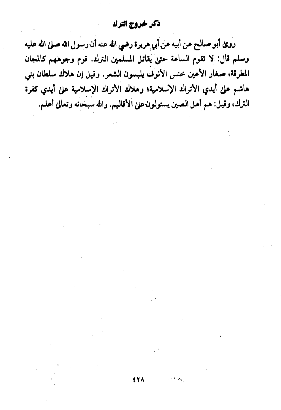روى أبو صالح عن أبيه عن أبي هريرة رضي الله عنه أن رسول الله صلى الله عليه وسلم قال: لا تقوم الساعة حتى يقاتل المسلمين الترك. قوم وجوههم كالمجان المطرقة، صغار الأعين خنس الأنوف يلبسون الشعر. وقيل إن هلاك سلطان بني هاشم على أيدي الأتراك الإسلامية؛ وهلاك الأتراك الإسلامية على أيدي كفرة الترك، وقيل: هم أهل الصين يستولون على الأقاليم. والله سبحانه وتعالى أعلم.