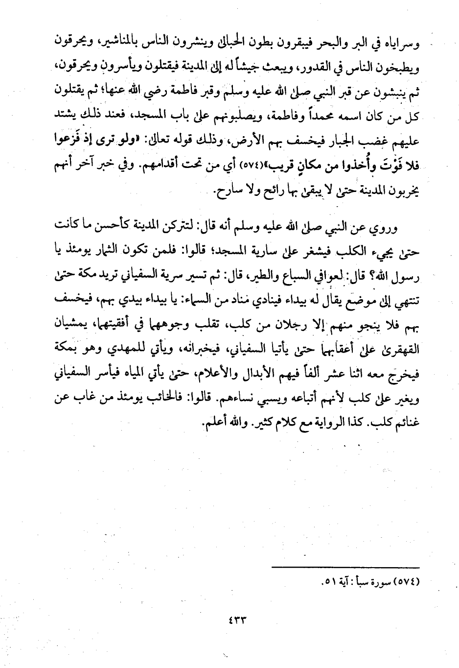 وروي عن النبي صلى الله عليه وسلم أنه قال: لتتركن المدينة كأحسن ما كانت حتى يجيء الكلب فيشغر على سارية المسجد؛ قالوا: فلمن تكون الثمار يومئذ يا رسول الله؟ قال: لعوافي السباع والطير، قال: ثم تسير سرية السفياني تريد مكة حتى تنتهي إلى موضع يقال له بيداء فينادي مناد من السماء: يا بيداء بيدي بهم، فيخسف بهم فلا ينجو منهم إلا رجلان من كلب، تقلب وجوههما في أفقيتهما، يمشيان القهقرى على أعقابهما حتى يأتيا السفياني، فيخبرانه، ويأتي للمهدي وهو بمكة فيخرج معه اثنا عشر ألفاً فيهم الأبدال والأعلام، حتى يأتي المياه فيأسر السفياني ويغير على كلب لأنهم أتباعه ويسبي نساءهم. قالوا: فالخائب يومئذ من غاب عن غنائم كلب. كذا الرواية مع كلام كثير. والله أعلم.