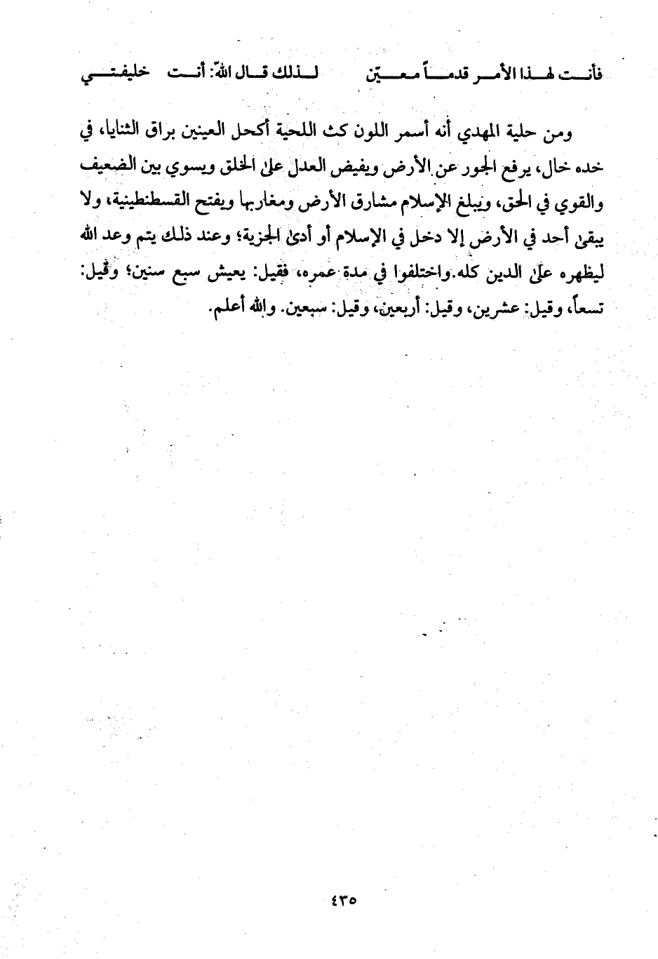 ومن حلية المهدي أنه أسمر اللون كث اللحية أكحل العينين براق الثنايا، في خده خال، يرفع الجور عن الأرض ويفيض العدل على الخلق ويسوي بين الضعيف والقوي في الحق، ويبلغ الإسلام مشارق الأرض ومغاربها ويفتح القسطنطينية، ولا يبقى أحد في الأرض إلا دخل في الإسلام أو أدى الجزية؛ وعند ذلك يتم وعد الله ليظهره على الدين كله.
