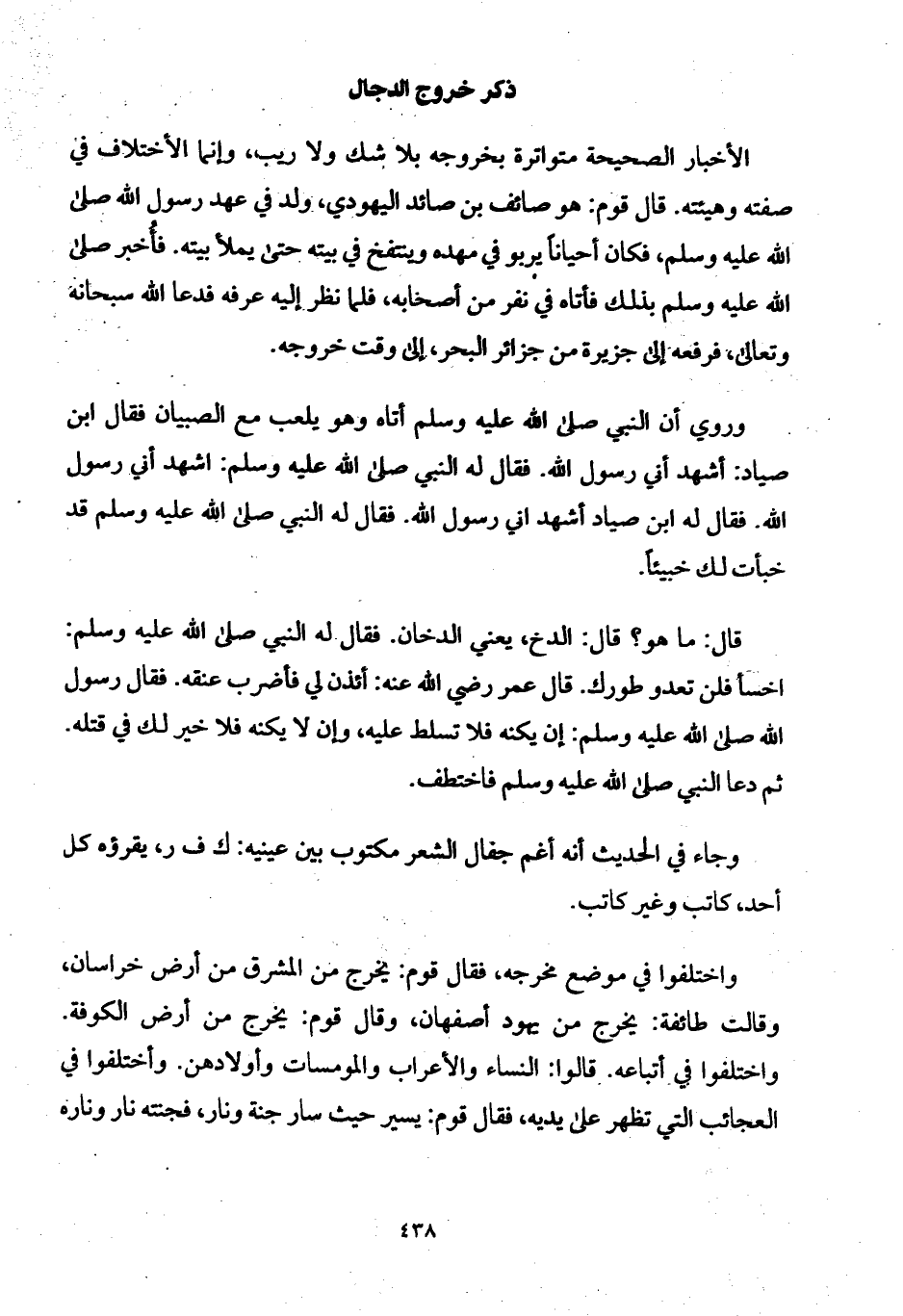قال: ما هو؟ قال: الدخ، يعني الدخان. فقال له النبي صلى الله عليه وسلم: اخسأ فلن تعدو طورك. قال عمر رضي الله عنه: أئذن لي فأضرب عنقه. فقال رسول الله صلى الله عليه وسلم: إن يكنه فلا تسلط عليه، وإن لا يكنه فلا خير لك في قتله. ثم دعا النبي صلى الله عليه وسلم فاختطف.