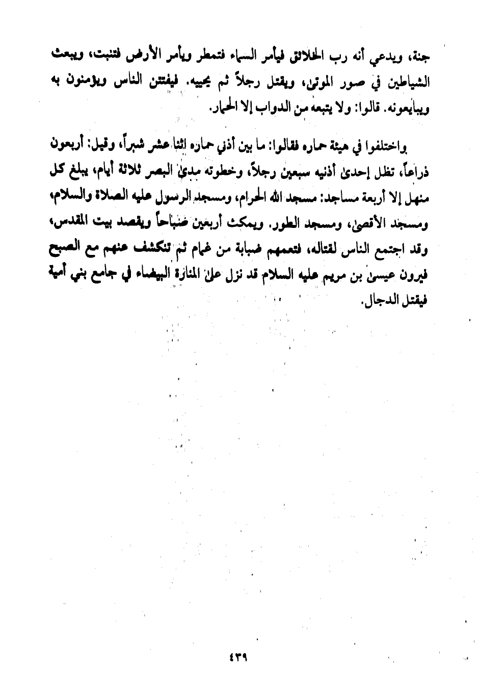 واختلفوا في هيئة حماره فقالوا: ما بين أذني حماره اثنا عشر شبراً، وقيل: أربعون ذراعاً، تظل إحدى أذنيه سبعين رجلاً، وخطوته مدى البصر ثلاثة أيام، يبلغ كل منهل إلا أربعة مساجد: مسجد الله الحرام، ومسجد الرسول عليه الصلاة والسلام، ومسجد الأقصى، ومسجد الطور. ويمكث أربعين صباحاً ويقصد بيت المقدس، وقد اجتمع الناس لقتاله، فتعمهم ضبابة من غمام ثم تنكشف عنهم مع الصبح فيرون عيسى بن مريم عليه السلام قد نزل على المنارة البيضاء في جامع بني أمية فيقتل الدجال.