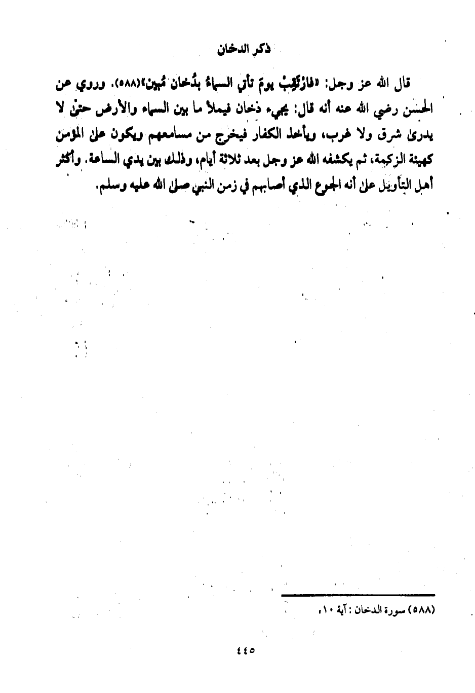 قال الله عز وجل: " فارْتَقِبْ يومَ تأتي السماءُ بدُخان مُبين ". وروي عن الحسن رضي الله عنه أنه قال: يجيء دخان فيملأ ما بين السماء والأرض حتى لا يدرى شرق ولا غرب، ويأخذ الكفار فيخرج من مسامعهم ويكون على المؤمن كهيئة الزكمة، ثم يكشفه الله عز وجل بعد ثلاثة أيام، وذلك بين يدي الساعة. وأكثر أهل التأويل على أنه الجوع الذي أصابهم في زمن النبي صلى الله عليه وسلم.
