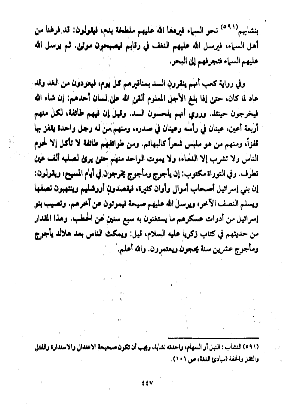 بنشابهم نحو السماء فيردها الله عليهم ملطخة بدم، فيقولون: قد فرغنا من أهل السماء، فيرسل الله عليهم النغف في رقابم فيصبحون موتى. ثم يرسل الله عليهم السماء فتجرفهم إلى البحر.