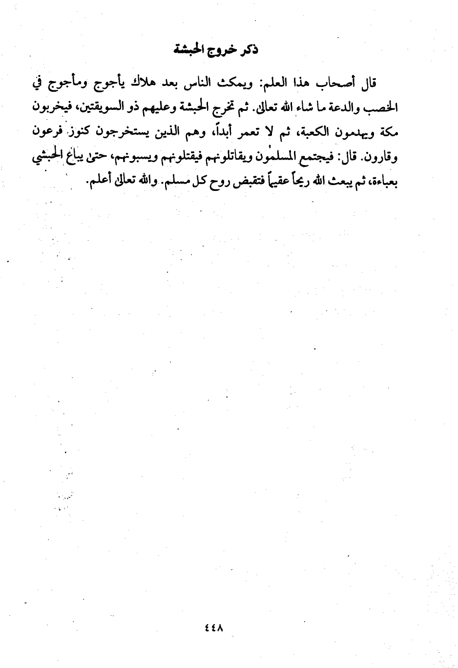 قال أصحاب هذا العلم: ويمكث الناس بعد هلاك يأجوج ومأجوج في الخصب والدعة ما شاء الله تعالى. ثم تخرج الحبشة وعليهم ذو السويقتين، فيخربون مكة ويهدمون الكعبة، ثم لا تعمر أبداً، وهم الذين يستخرجون كنوز فرعون وقارون. قال: فيجتمع المسلمون ويقاتلونهم فيقتلونهم ويسبونهم، حتى يباع الحبشي بعباءة، ثم يبعث الله ريحاً عقيماً فتقبض روح كل مسلم. والله تعالى أعلم.